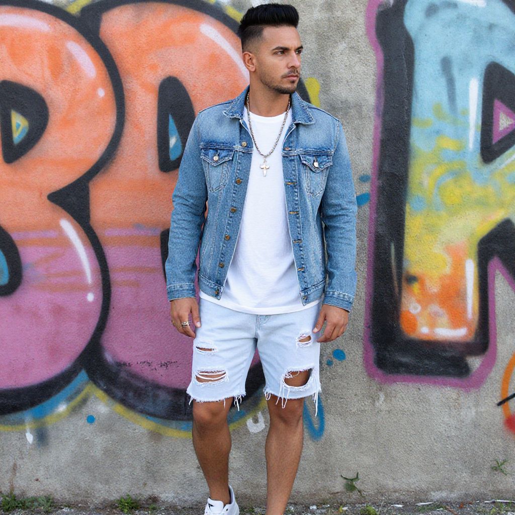 A stylish man poses confidently in front of a vibrant graffiti wall, showcasing a casual fashion ensemble with a denim jacket and ripped shorts.