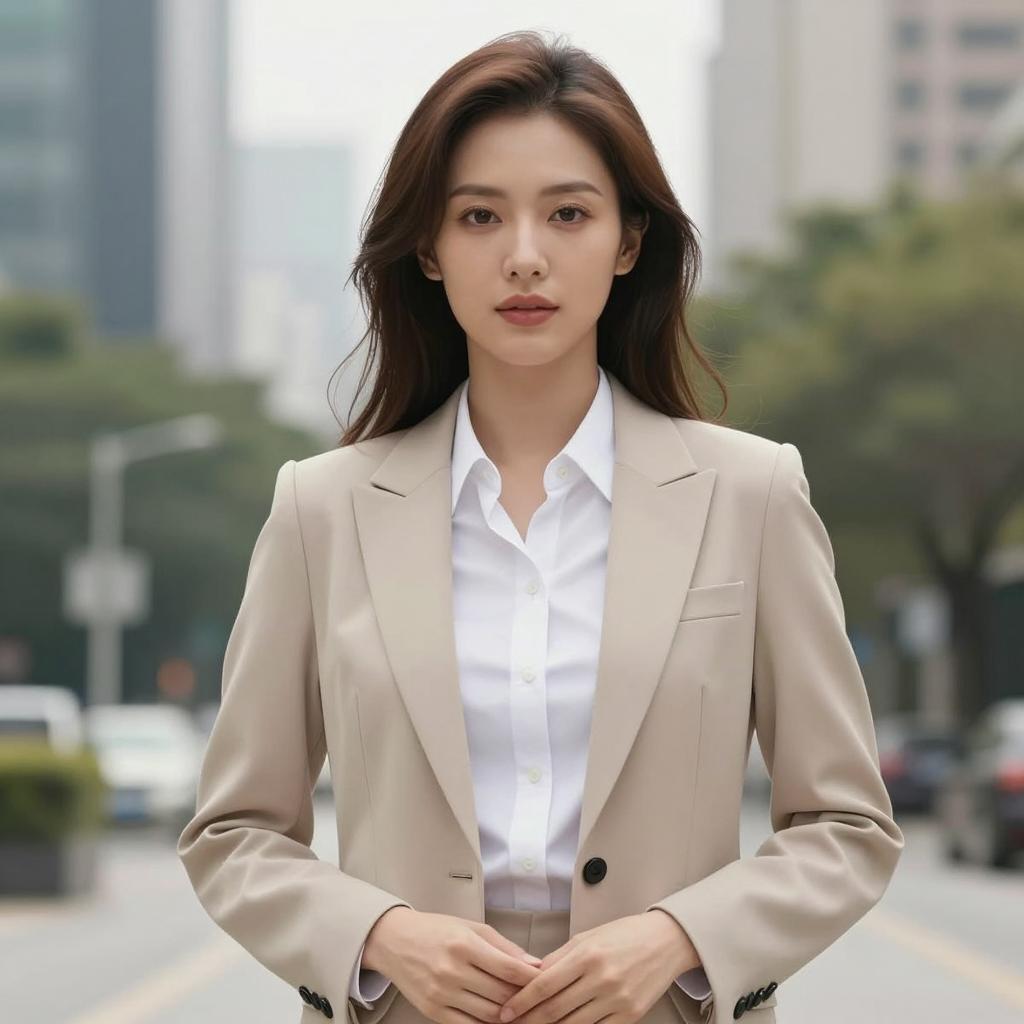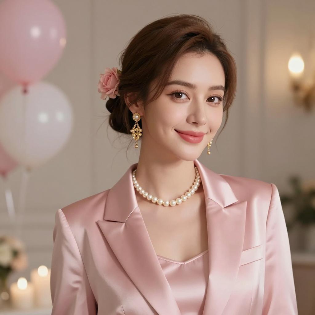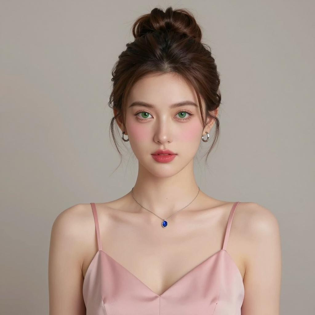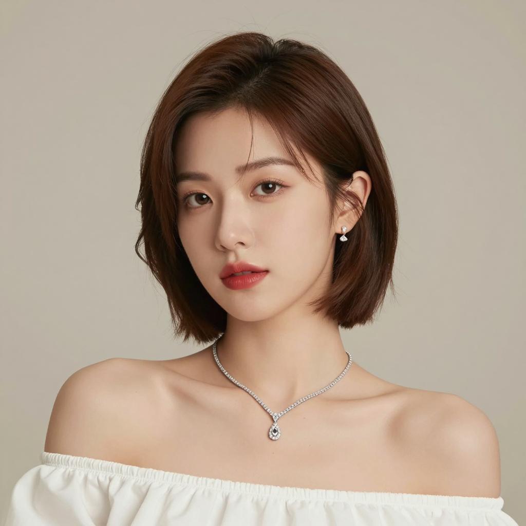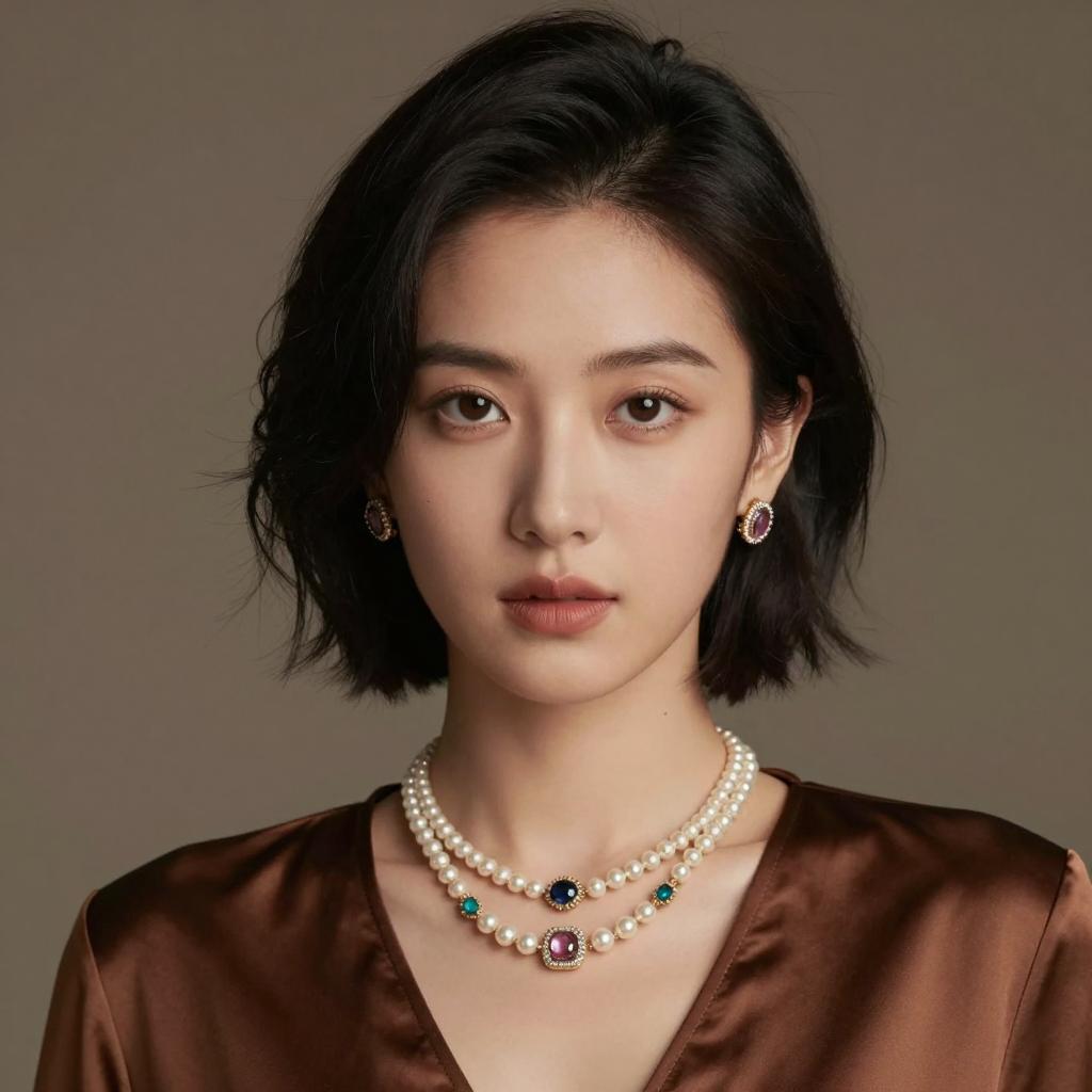 Glamorous portrait of an Asian woman with voluminous curly dark hair styled elegantly, wearing a black off-shoulder dress paired with an elaborate diamond and sapphire necklace and matching earrings. Captured with cinematic lighting on a smooth light gray background, highlighting her flawless skin and refined makeup.