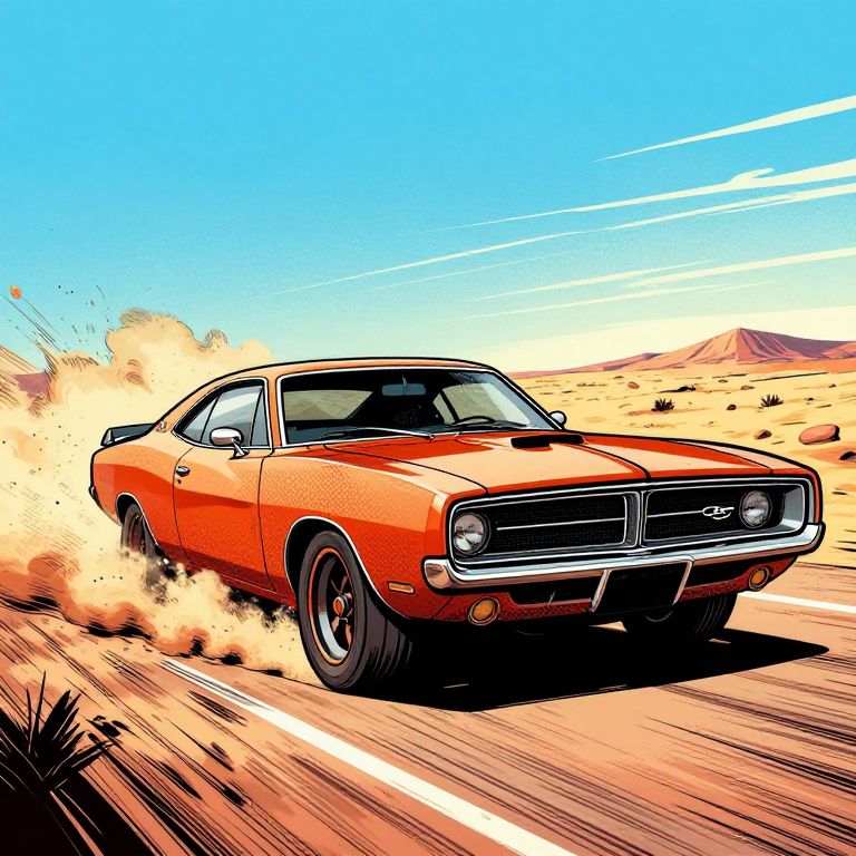 Dodge Charger SRT drawing, vintage comic book style illustration with bold outlines and halftone shading, the car roaring through desert highway, dust clouds trailing behind, intense action scene highlighting horsepower and design features
