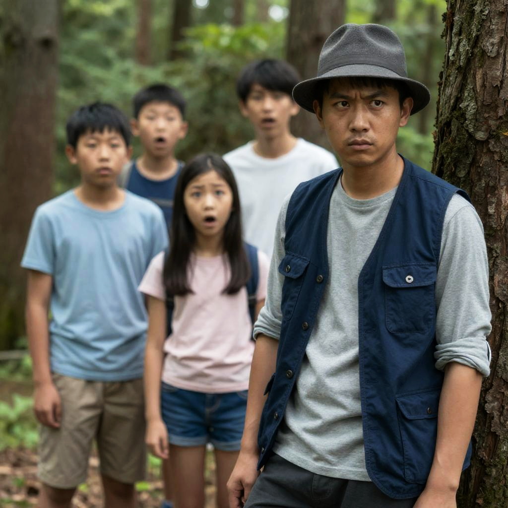 Photograph of five people in a forest. Foreground: man in red cap, blue sleeveless shirt, left, grabbing dirty, disheveled man with messy hair, plaid shirt, and brown vest. Background: three people, one with glasses, two with worried expressions, standing close. Green foliage, trees, forest background. Intense expressions, urgent interaction.