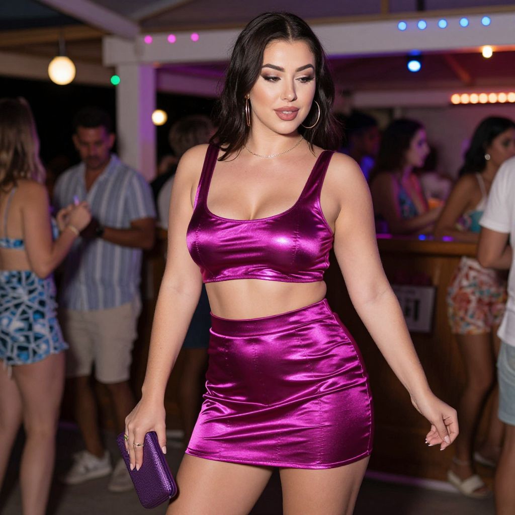 A stocky woman, camera obscura style, in modern party fashion, metallic magenta crop top and matching high-waisted mini skirt, shiny satin-like material, holding a purple clutch, at a lively beach bar, dancing under colorful lights. Sexy. Pretty face and beаutiful eyes. Big breasts