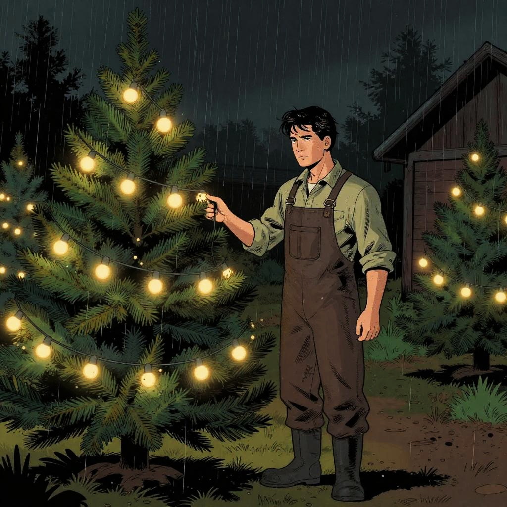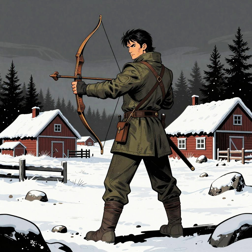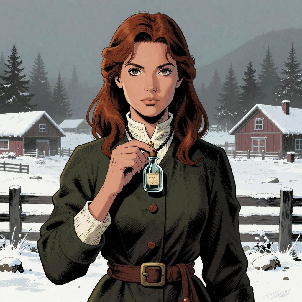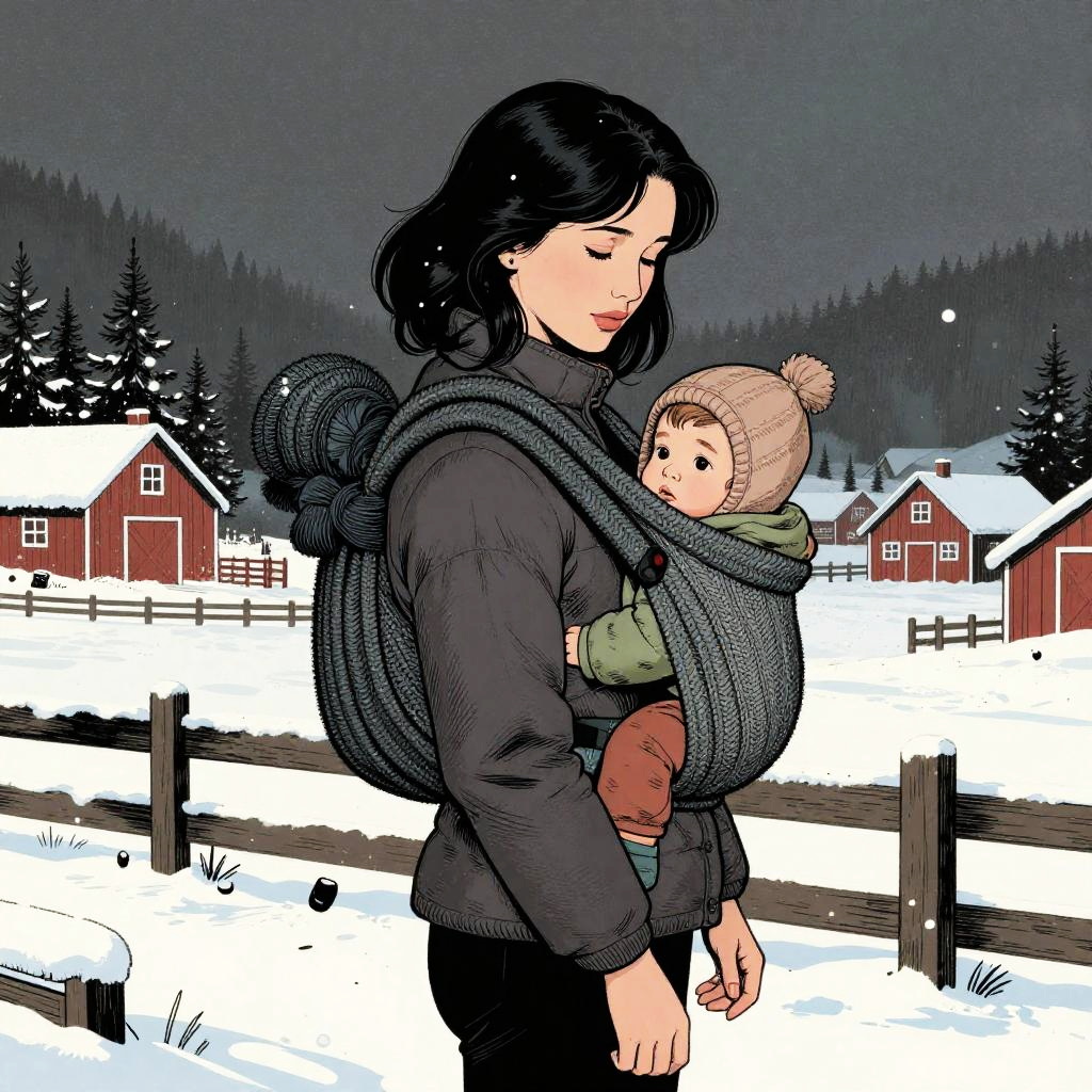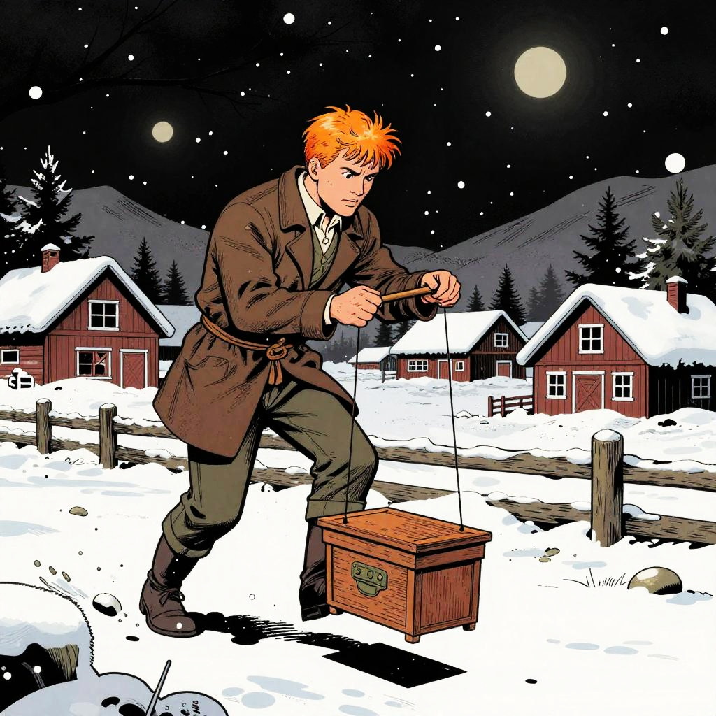 Traveling puppeteer with marionette box, black hair, Christmas farm, heavy snowfall, detailed, dark colors, dramatic, graphic novel illustration, 2d shaded retro comic book