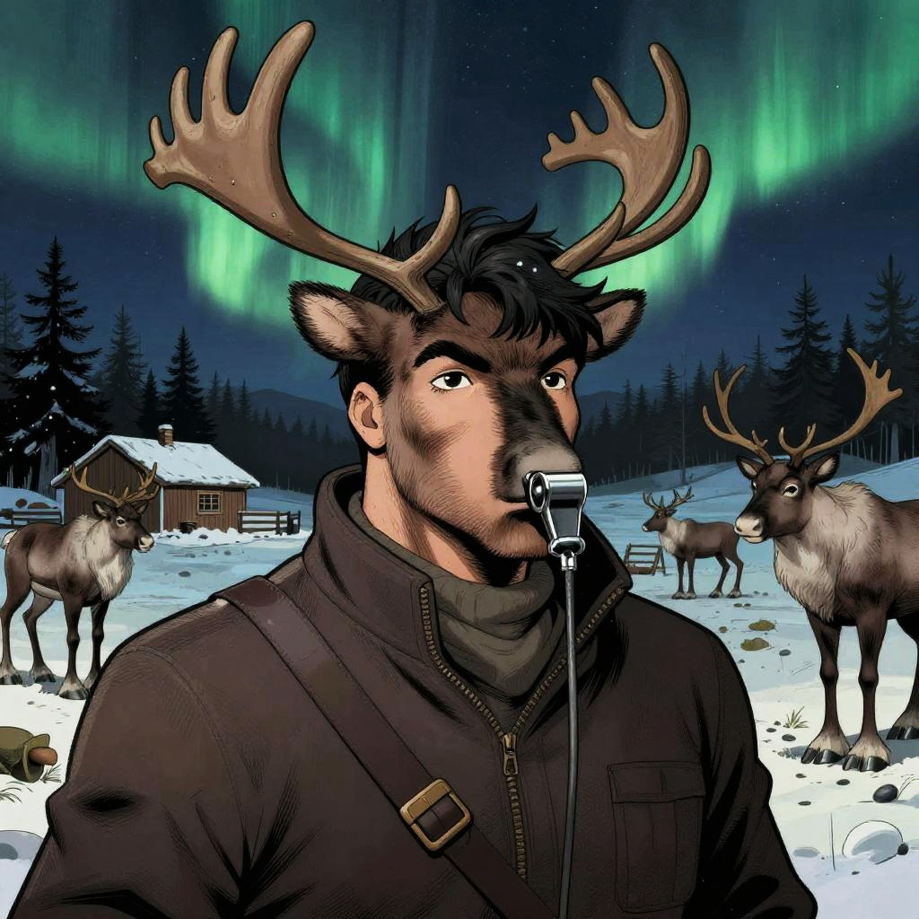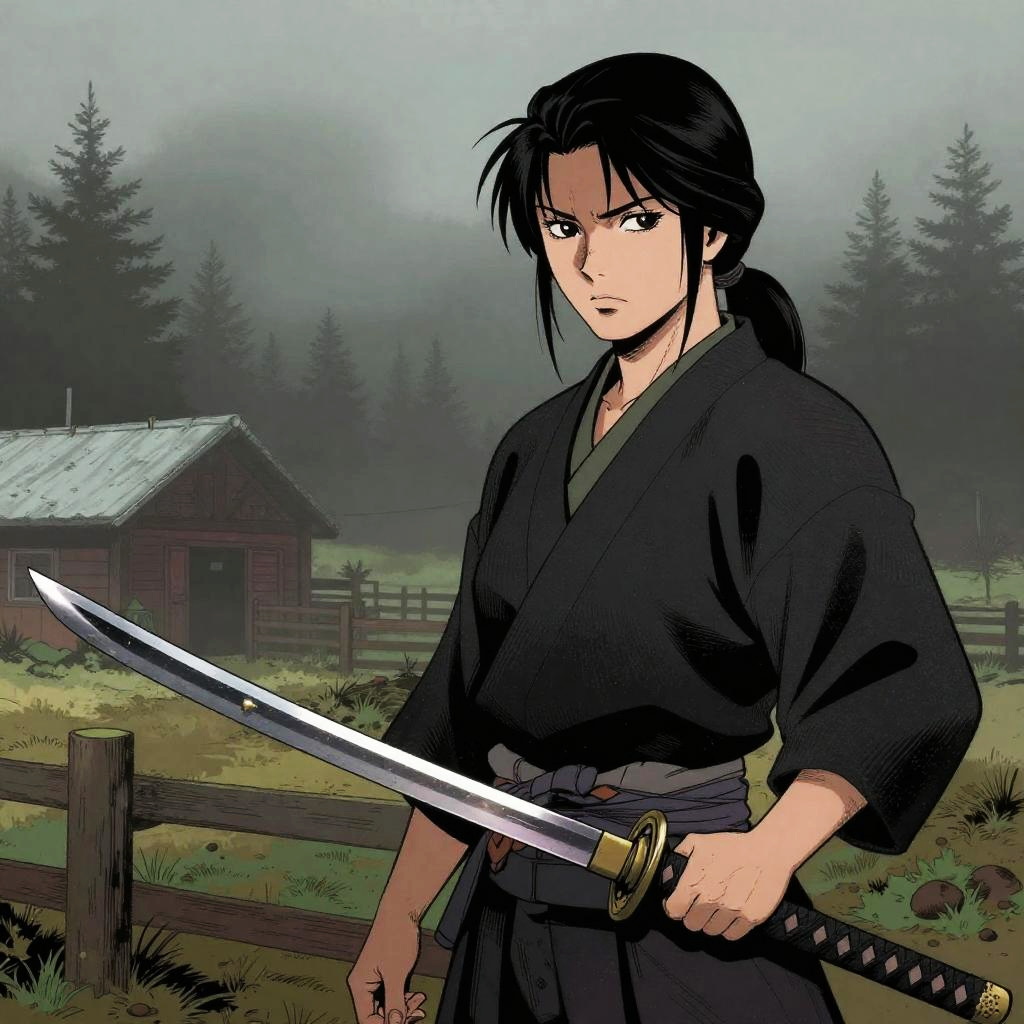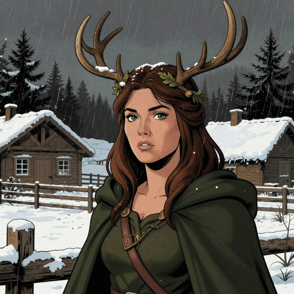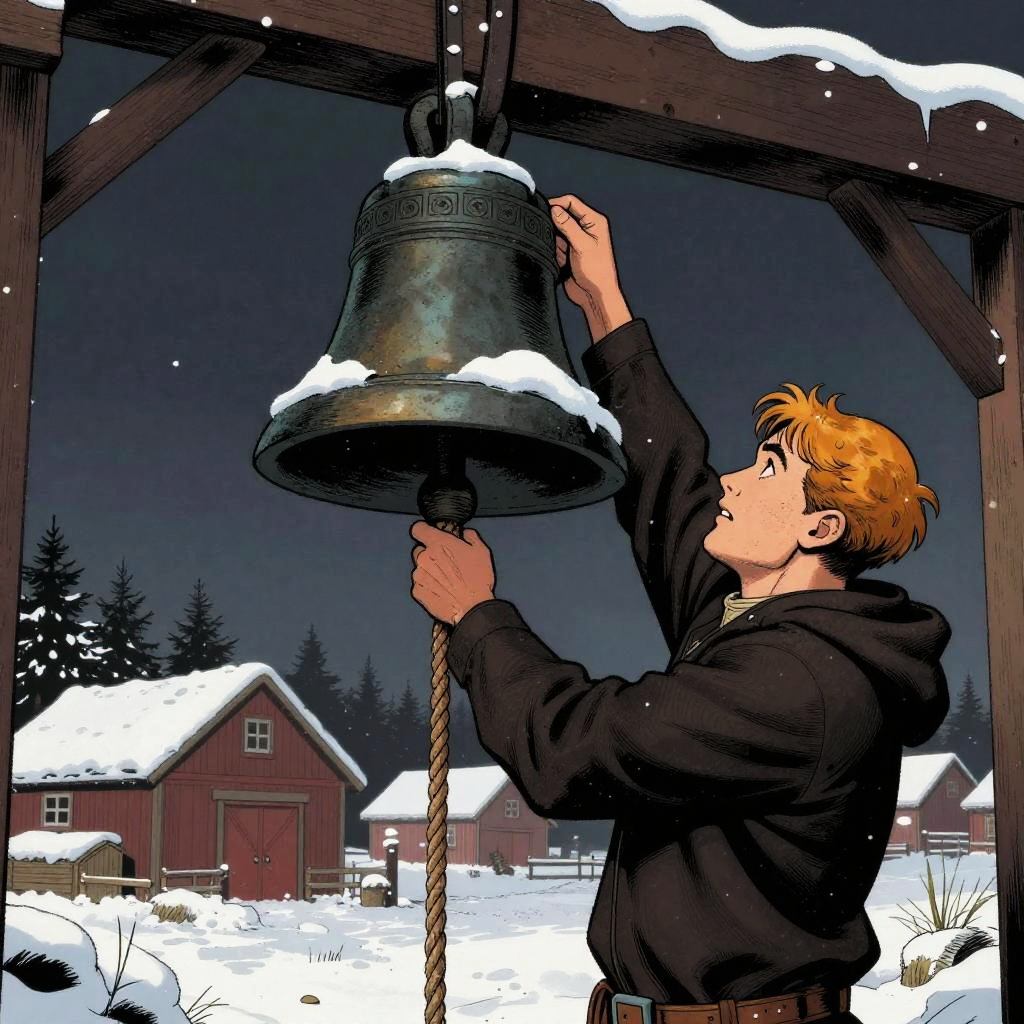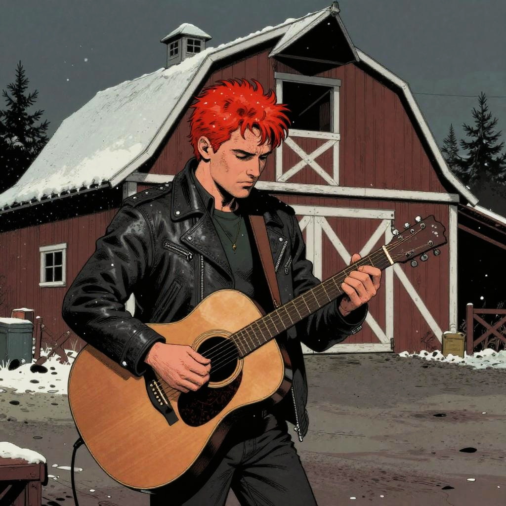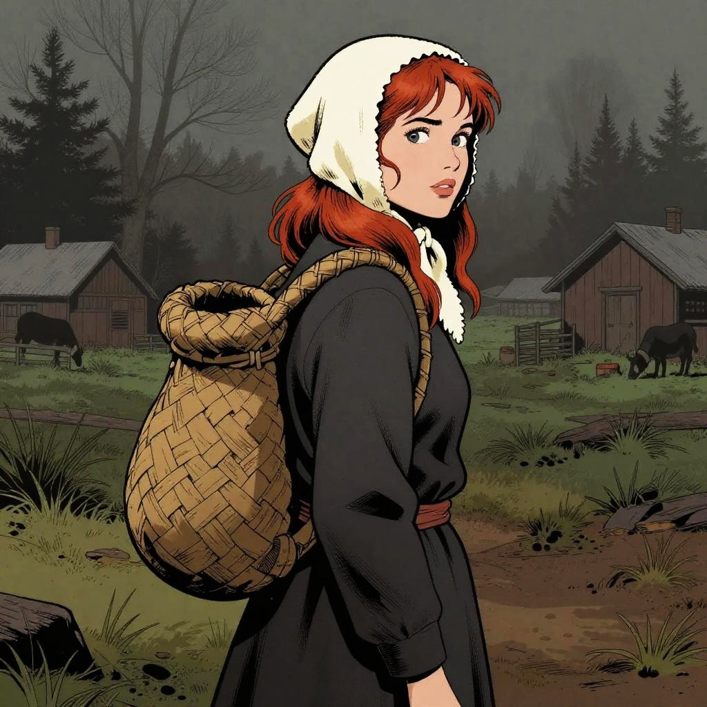 Traveling puppeteer with marionette box, black hair, Christmas farm, heavy snowfall, detailed, dark colors, dramatic, graphic novel illustration, 2d shaded retro comic book