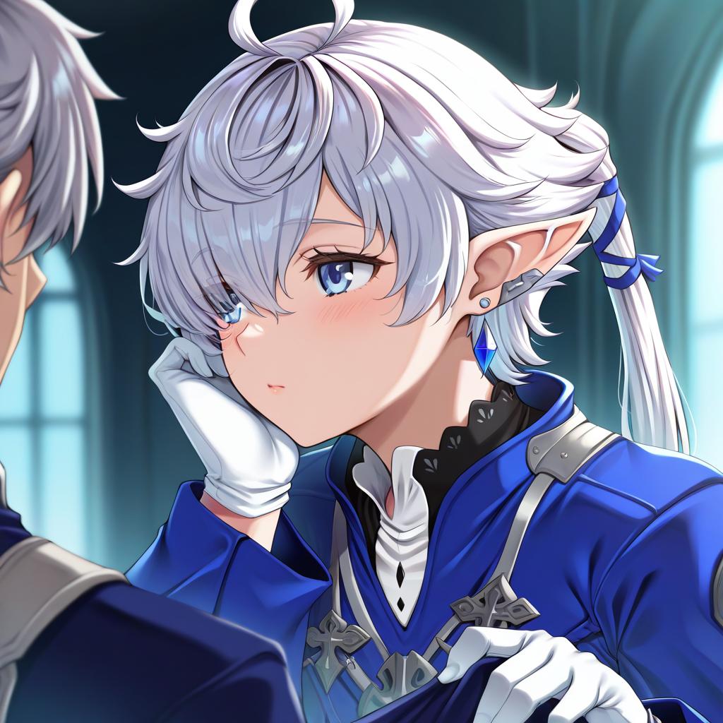 Alphinaud leveilleur, final fantasy, 1boy, blue eyes, hair between eyes, hair over one eye, white hair, long hair, grey hair, ahoge, ponytail, hair ribbon, white gloves, blue coat, earrings, elezen, earclip, by artist moisture (chichi), illustrious