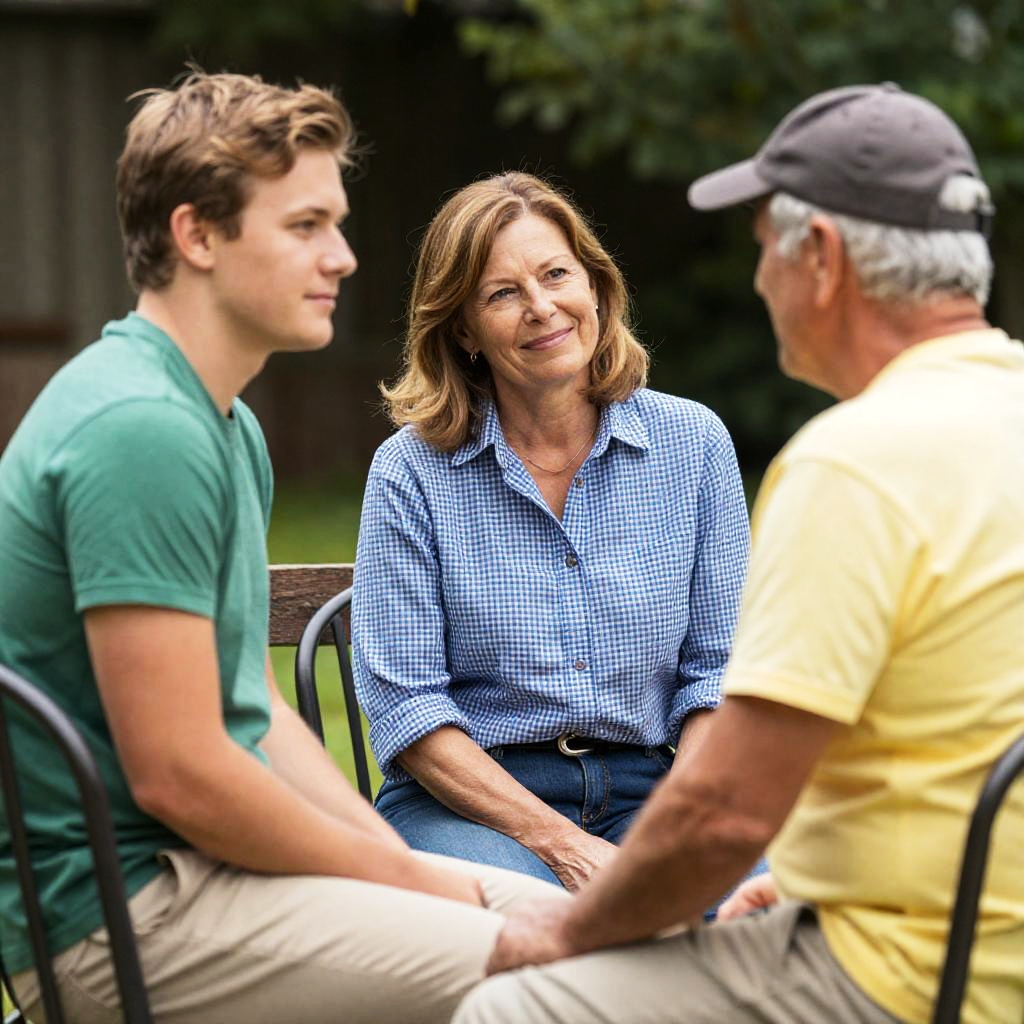 Photograph of a park scene. An older man with short brown hair, blue jacket, and green shirt hands a piece of paper to a young boy with short blond hair, green sleeveless hoodie, and arm tattoos. The boy looks down. In the background, a blonde girl in a pink and white striped shirt holds a lemon, standing by a red and white checkered picnic table. Trees and a wooden picnic table are visible. The older man smiles slightly. The boy's arm tattoos are detailed. The scene is outdoors.