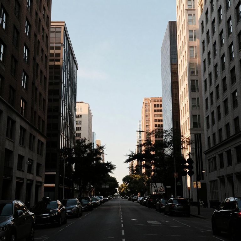 Photograph of a narrow urban street flanked by tall, modern buildings with reflective glass facades, parked cars lining both sides, under a clear,