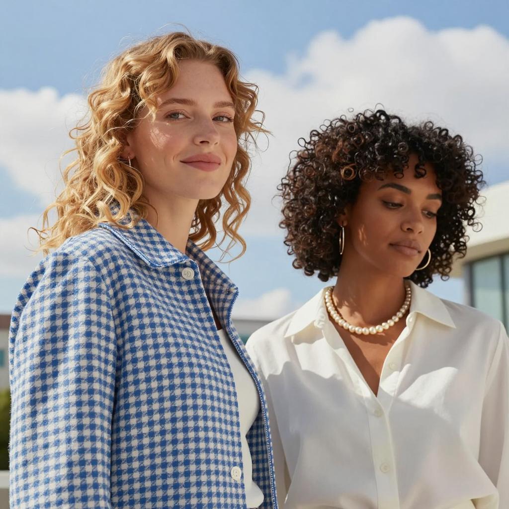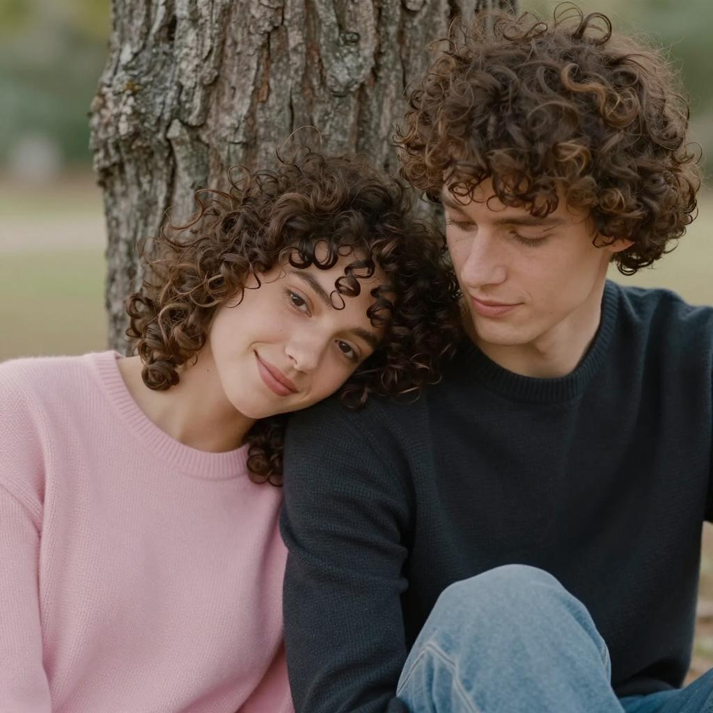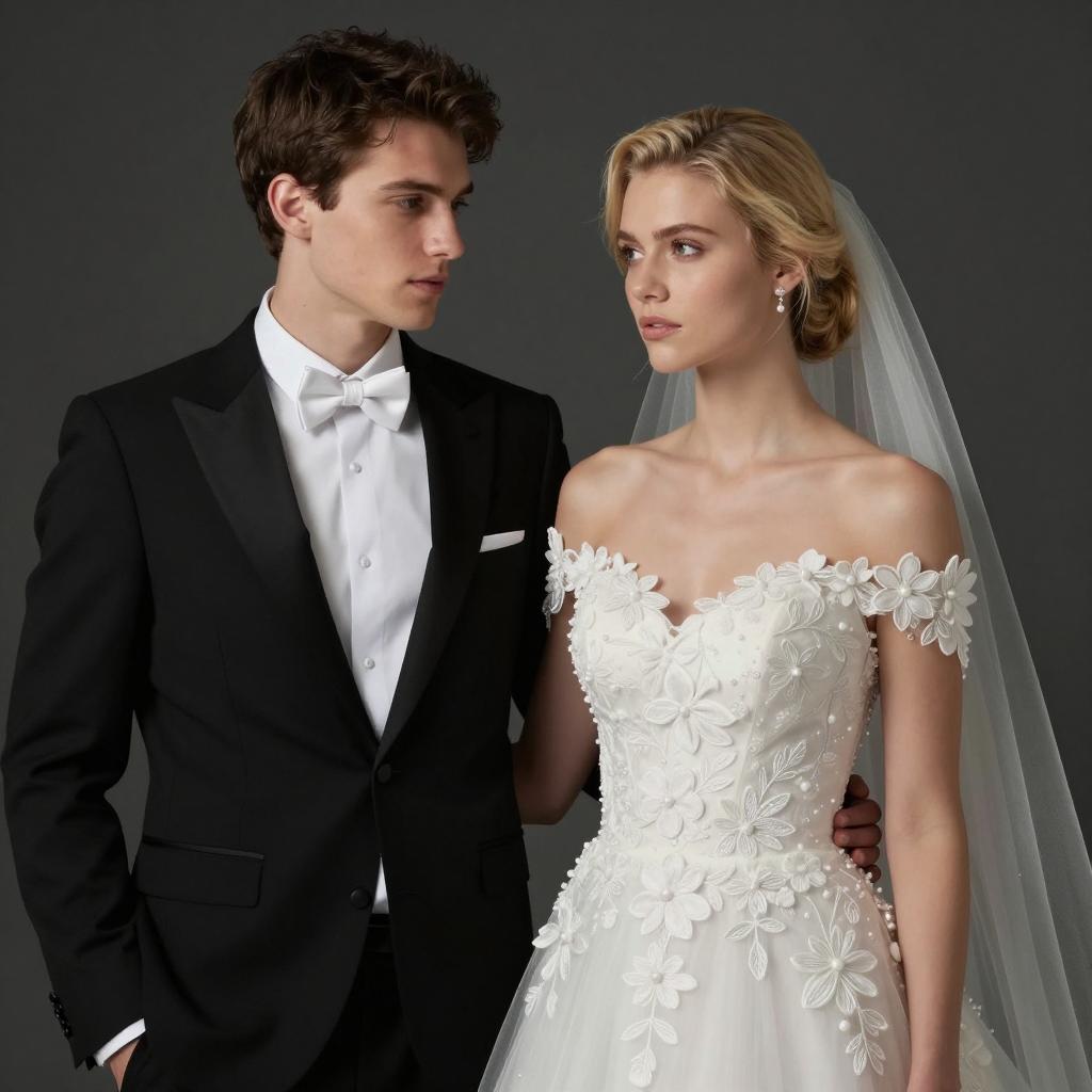 A color photograph of a man and woman sitting close together outdoors. The man has dark curly hair, wears a white suit, and looks directly at the camera with a neutral expression. The woman has blonde curly hair, wears a white lace dress, and looks slightly to the side. They are in a grassy area with a small, white building in the background. The woman's hand rests on the man's thigh, and they sit with legs crossed. Both wear white socks.