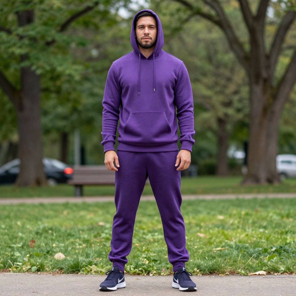 Purple Tracksuit Costume, man in a purple hoodie and pants standing in a park