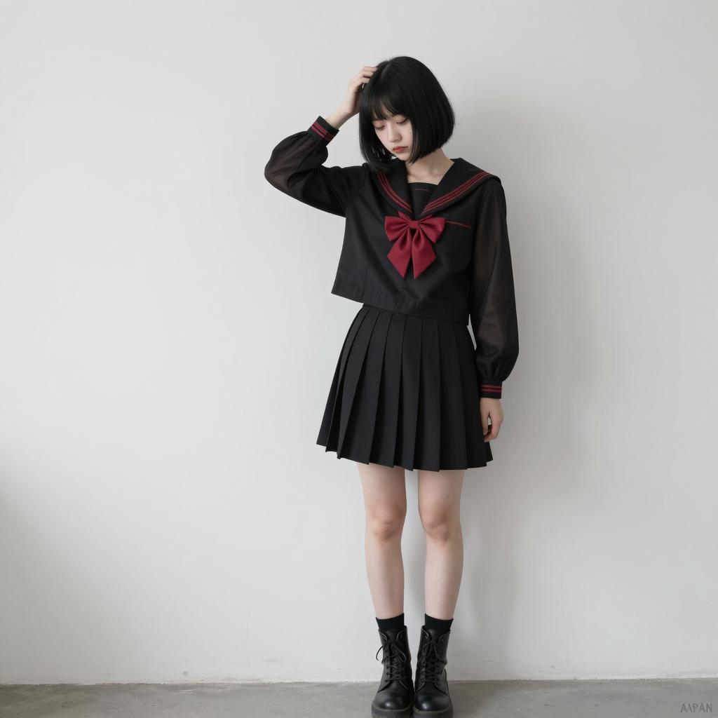 Asian woman with long black hair, wearing a white sailor top with red bow, black pleated skirt, black tights, and black shoes. She stands in a concrete balcony, hand in hair, looking down. Overcast background with metal railing and buildings. Natural light. Photographic style.
