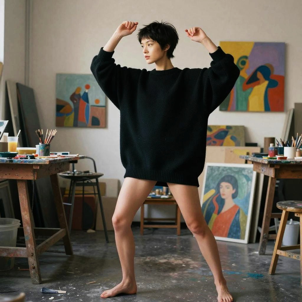 Nsfw, best quality, masterpiece, ultra high res, (photorealistic:1.3), 8K, raw photo, 1girl, full body, (very short hair:1.4), (pixie cut:1.2), wearing oversized black pullover, modeling, dynamic pose, artist in her atelier, workshop, paint, natural skin texture, petite, artist, film grain, detailed background, (busy background:1.2), colorful