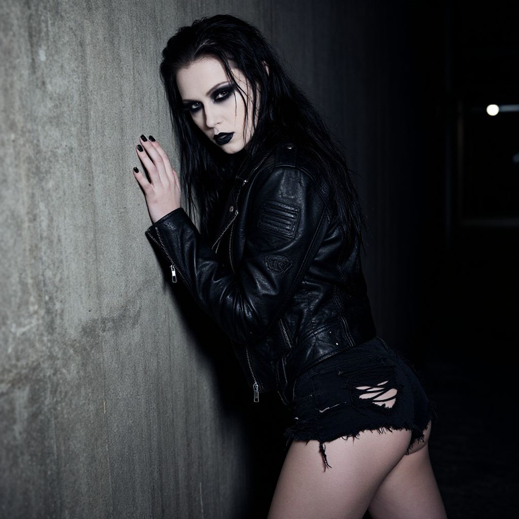 Photograph of a gothic-style woman with pale skin, dark eye makeup, and black lipstick. She's leaning against a rough, concrete wall in a dimly lit alley, wearing a black leather jacket with patches and frayed, black, ripped shorts that expose her buttocks. Her long, wet black hair clings to her face. She has black nails and a sultry, intense expression. The background is dark and industrial, with faint lights in the distance.