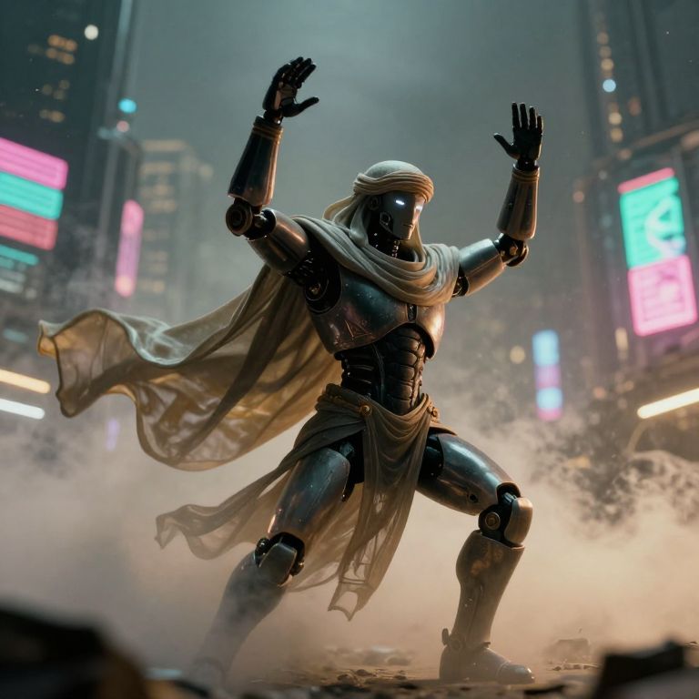 Photo of an Elysium Robot Cyborg Samurai amidst a SWarm of bees, macro, flowing Cape, a captivating vibrant dark capturing the essence of a cyborg Bedouin sorcerer in fight stance, standing infront of dystopian megacity, ethereal, smoky backdrop, a translucent Grey, yellow/tanslucent amber/black, atmospheric haze, Film grain, shallow depth of field, moody, epic, 2000s vintage RAW photo, photorealistic, eye catchlights, atmospheric lighting, skin pores, imperfections, natural, shallow dof, their holographic billboards flickering in shades of pink, green, and electric blue, Streams of light weave through