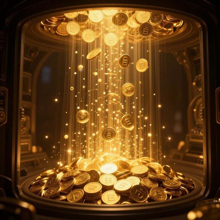 This is a digital CGI image depicting a glowing, golden, circular container from which numerous gold coins with symbols on them are suspended mid-air. The coins, illuminated with a bright, warm light, are held by thin, vertical lines of light. The background is dark, with subtle, out-of-focus architectural elements suggesting a rich, ornate setting. The container's interior is detailed with intricate patterns, enhancing the luxurious feel. The coins and light create a radiant, magical effect, with some coins slightly blurred to convey motion. The overall style is realistic with a fantastical, glowing aesthetic.