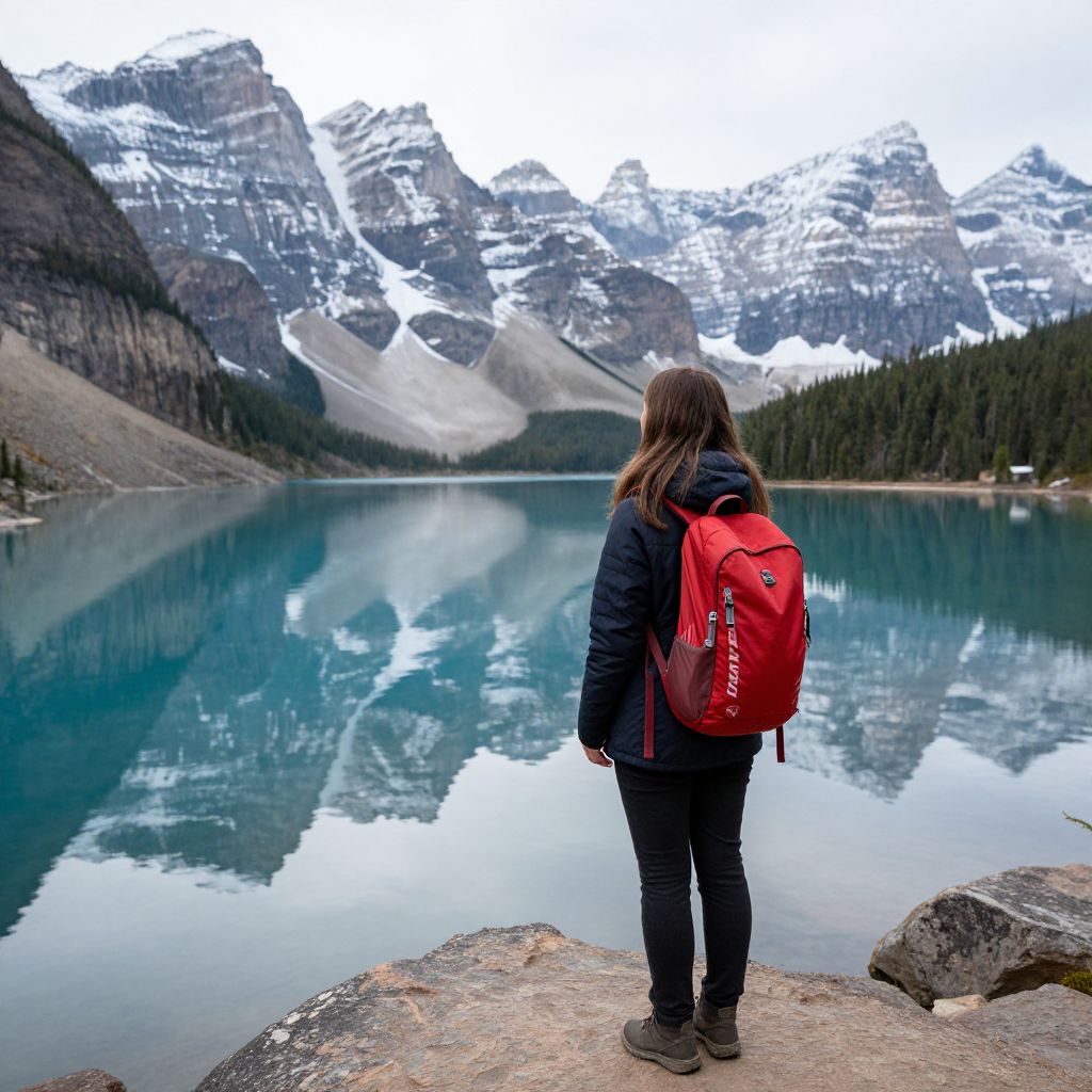 A woman with long brown hair, wearing a dark jacket and carrying a vibrant red backpack, stands on the rocky shore of Moraine Lake, gazing at its serene turquoise waters reflecting the majestic snow-capped peaks of Banff National Park.