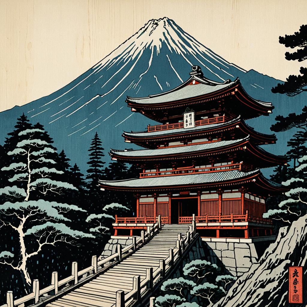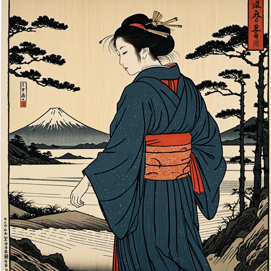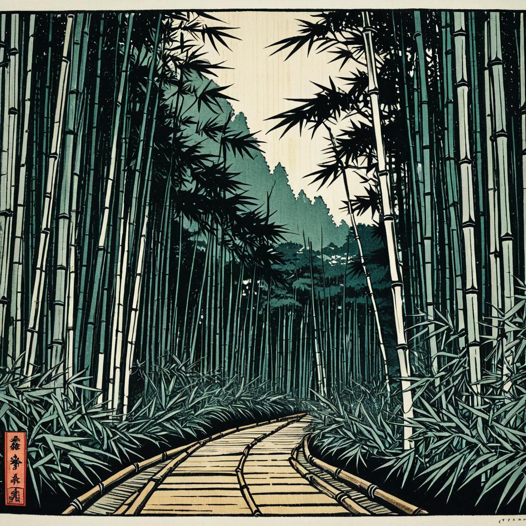 Ukiyo-e woodblock print of a bamboo forest in the style of Gwyntoki. The print features intricate lines and traditional Japanese woodblock color palette.
