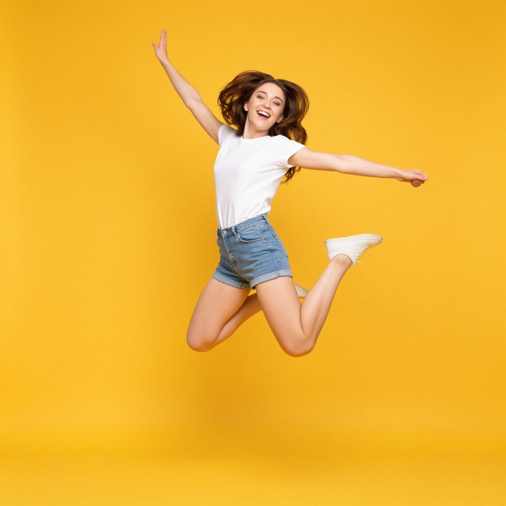 Cheerful young woman mid-jump against a vibrant yellow background, arms outstretched, hair flowing, exuding joy and energy.