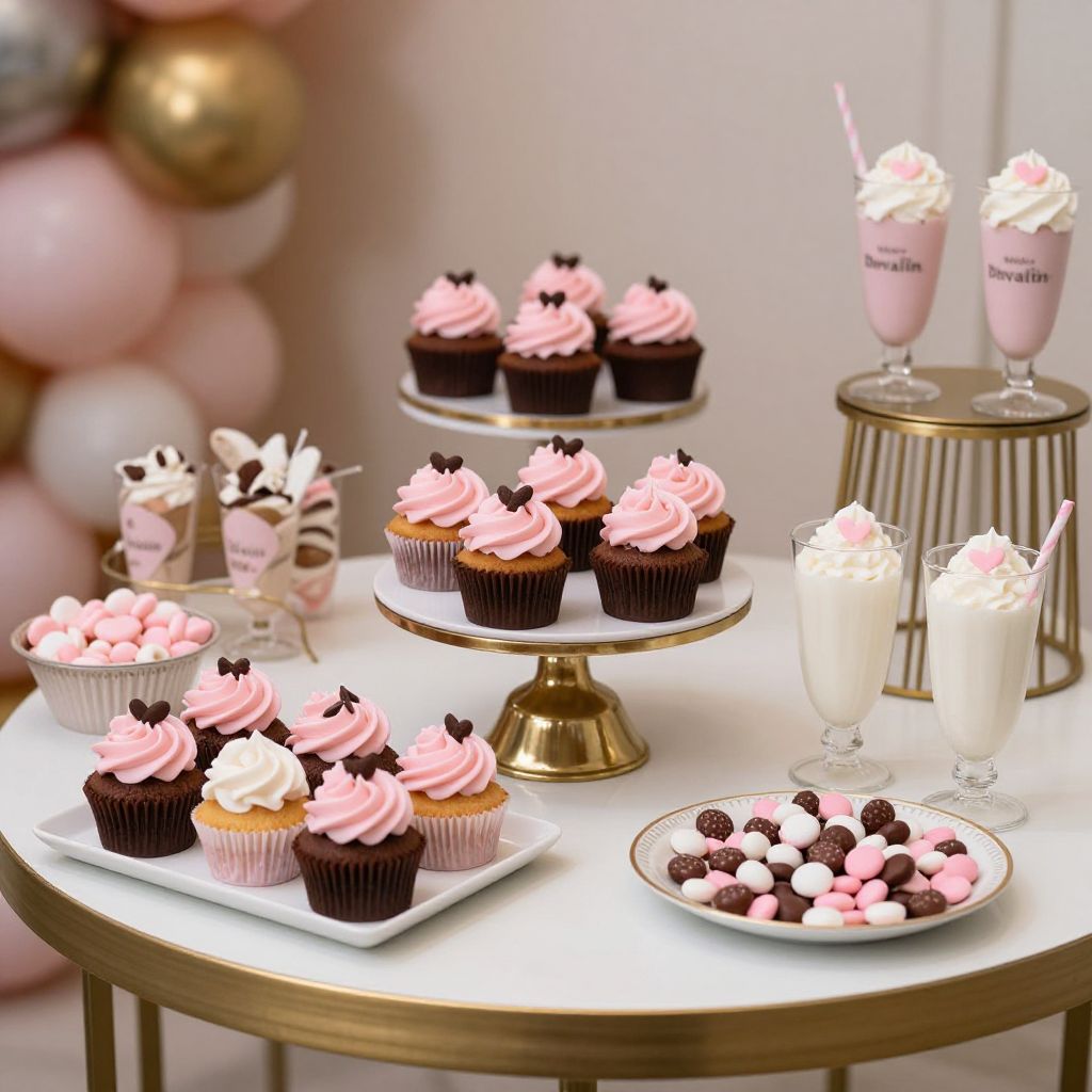 Elegant dessert table featuring an array of pink and brown cupcakes with pink frosting and chocolate hearts, assorted candies, and creamy milkshakes topped with whipped cream and pink heart decorations. Decor includes soft bokeh background with metallic gold accents on trays and table edges, showcasing a sweet and creamy Duvalin flavor theme.