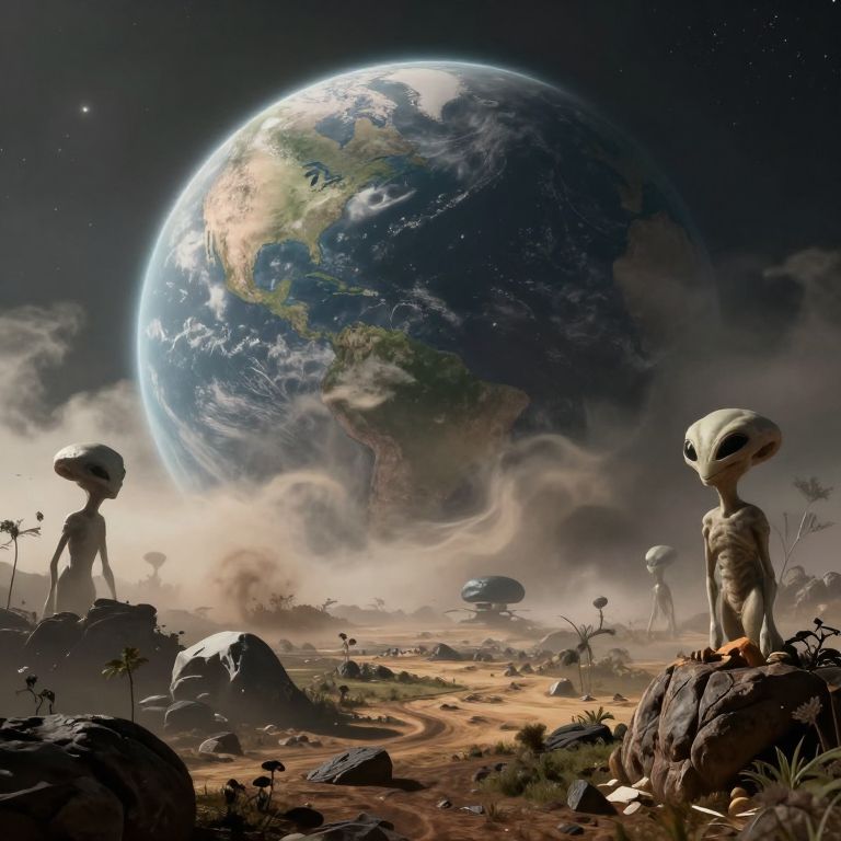 A digital art piece depicting a surreal, extraterrestrial landscape. Two alien-like humanoid figures with large, oval heads and elongated faces stand on rocky outcrops in the foreground, gazing at a massive, illuminated Earth in the background. The aliens have slender, almost skeletal bodies and are positioned on the right and left sides. The planet Earth dominates the sky, with swirling clouds and vivid blue oceans. The barren, rocky terrain stretches into the distance, dotted with small, distant structures and palm-like plants. The scene is bathed in a soft, otherworldly light, creating a mysterious, sci-fi atmosphere.