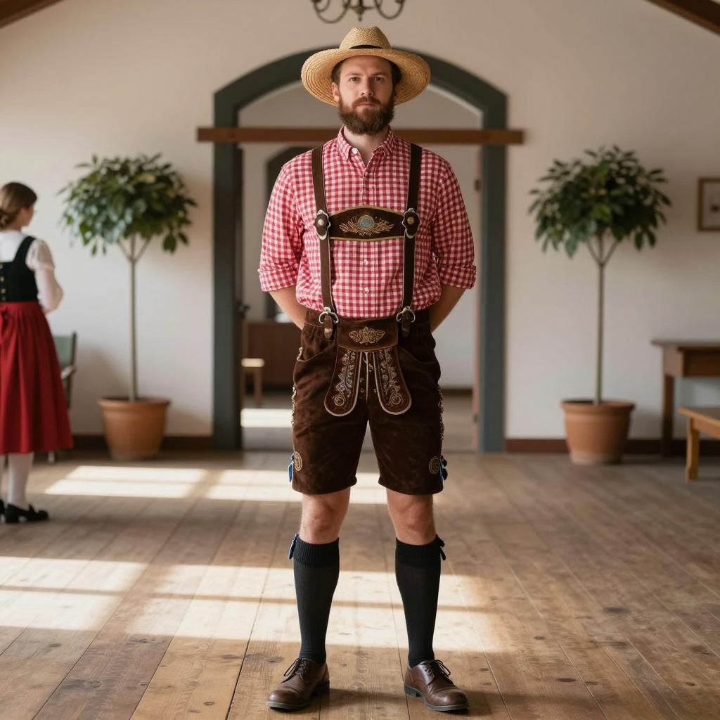 A bearded man wearing a green hat, brown leather lederhosen with suspenders, and a blue checkered shirt stands outdoors between two young women dressed in traditional Bavarian dirndl dresses featuring white blouses and blue skirts. The group is smiling with a sunlit natural background of green trees and a building, suggesting a casual daytime setting. The scene reflects traditional Oktoberfest or Bavarian cultural attire.