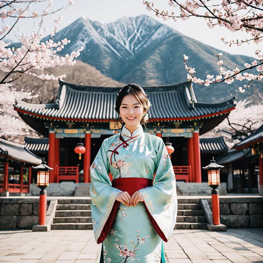 Harmony, an image of a Asian woman standing at the altar on her wedding day, radiating pure joy and happiness. She is wearing a stunning classic silk qipao wedding dress, her hair styled elegantly. Background includes a modern wedding hall with floral arches with flowers, candles, and other decor elements. The scene captures the magic and excitement of one of the most important days in a person’s life, with all its beauty and joy