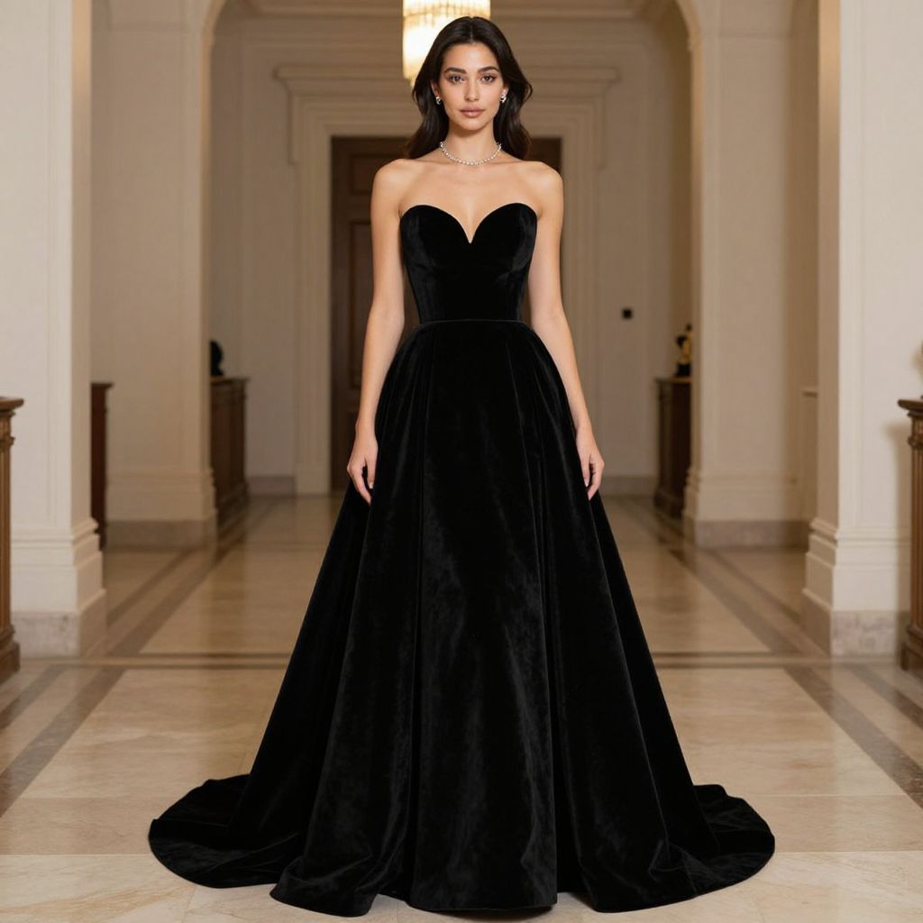 Photograph of a woman with medium-dark skin and black, wavy hair standing in a grand, beige hallway with marble flooring. She wears a strapless, black velvet gown with a sweetheart neckline and a voluminous, floor-length skirt. The dress fits her slender, tall frame elegantly. She accessorizes with a delicate necklace and a subtle bracelet. The background features arched doorways, wooden furniture, and soft, warm lighting that enhances the luxurious atmosphere. The image has a professional, high-fashion runway style.