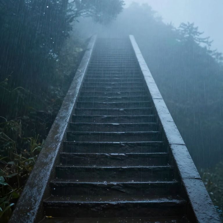 An ethereal staircase ascends into the mist, where rain defies gravity, each droplet a whisper of unfulfilled dreams carried by the weightless air, evoking a haunting blend of melancholy and transcendence.