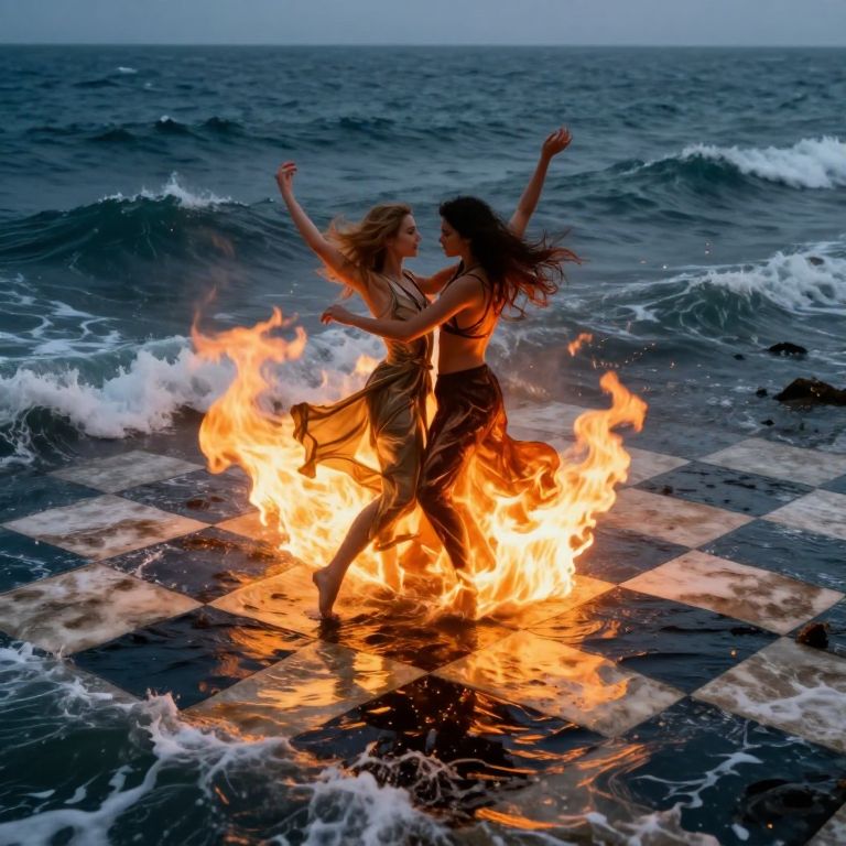 Photograph of two women dancing on a checkered tile beach, surrounded by flames, with ocean waves in the background.