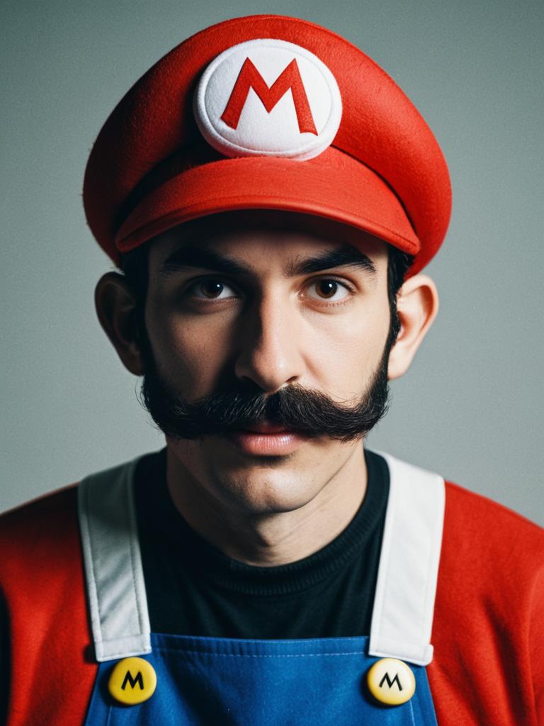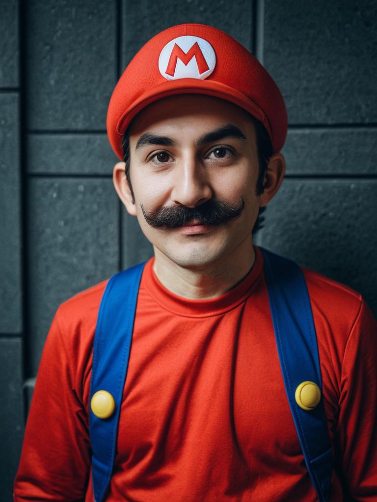Super mario as a drug dealer selling a magical mushroom in the alleys of los angeles, super mario in real life, red hat, blue overalls, canon eos r 3, f / 1. 4, iso 200, 1 / 160 s, 8 k, raw, unedited, symmetrical balance, wide angle