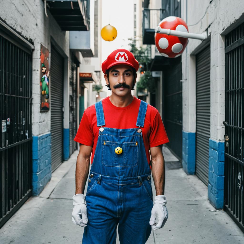 Young man dressed as Super Mario wearing a red hat with 'M' emblem, red shirt, blue denim overalls, and white gloves standing in an alleyway with urban buildings and storefronts. The scene includes decorative elements inspired by the Super Mario video game series such as a red and white mushroom and a yellow spherical object hanging in the background. The location appears to be a narrow city alley with a gritty yet vibrant atmosphere.