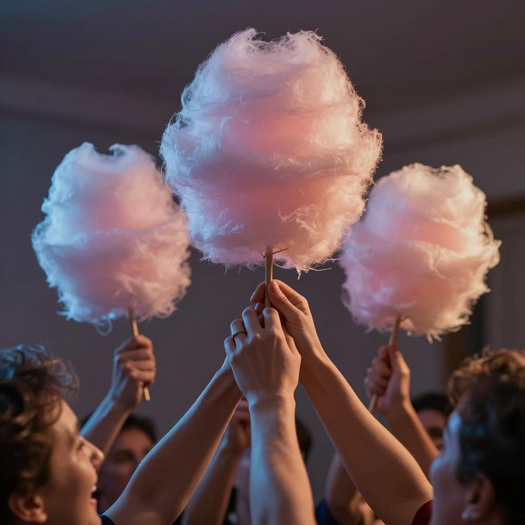 Close-up of multiple hands holding up pink cotton candy sticks together, illuminated with warm orange and blue cinematic lighting. The image captures a diverse group of people in a celebratory or rallying moment, showcasing soft, fluffy cotton candy in high detail with a photorealistic style.