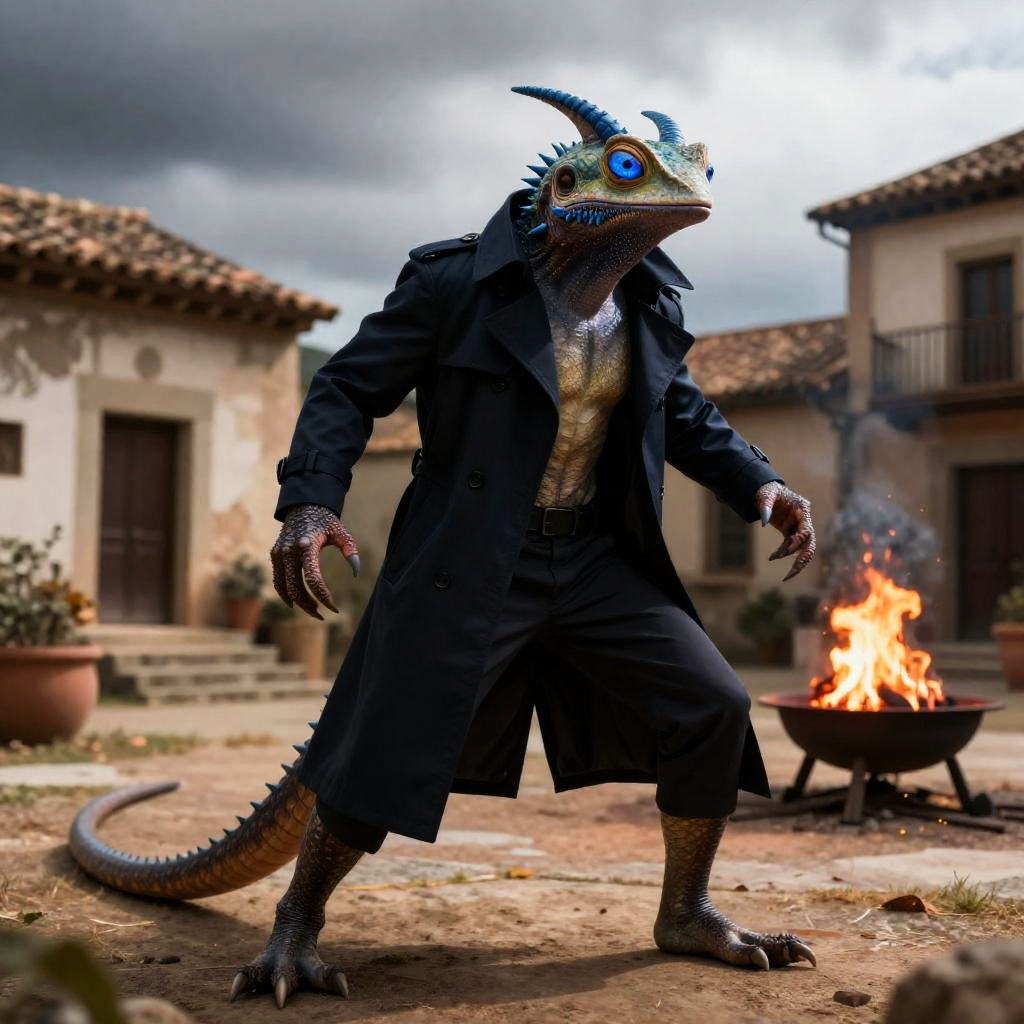 Solo, male, (athletic:0.7), (slim:0.8), (lean), secret agent, lizard, (defensive action pose):1.3, (kemono:0.2), trenchcoat, ((clothed)), detailed eyes, large tail, horns, ((bust portrait)), (detailed eyes, blue eyes, glowing eyes):1.1, (outdoors:1.35), altar, village, Spain, old decrepit buildings, autumn, firepit, overcast, (grey sky), day time, sun rays, (particles, firefly, red glowing):1.3, detailed background, photorealistic, realistic hands, 8k hd, (dark shadows, wide dynamic range, hdr), by (by Pino Daeni, (by ruaidri), by virtyalfobo), (best quality, masterpiece:1), furry scalie male anthro vergence, lizard, smooth body, blue teeth, wide-eyed, (dynamic angle), blue nose horn, blue ribbed eyebrows, detailed blue eyes, blue chin spikes, chin frills, spines, blue spikes going down back of neck, (detailed pupils)