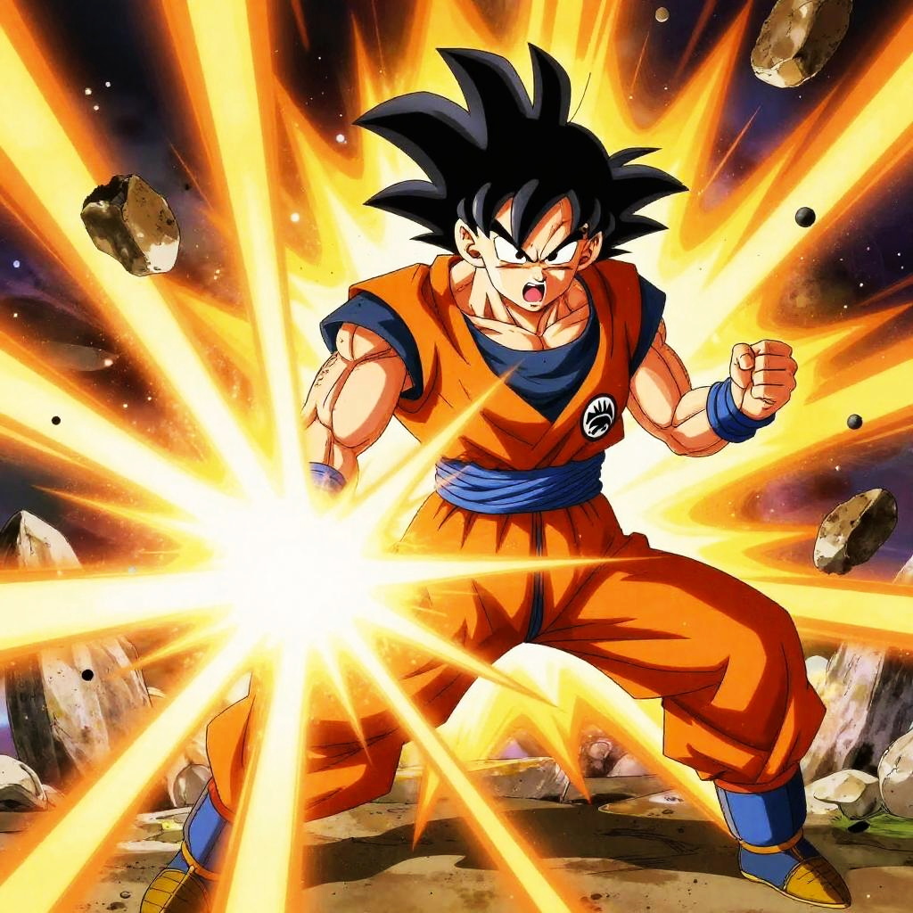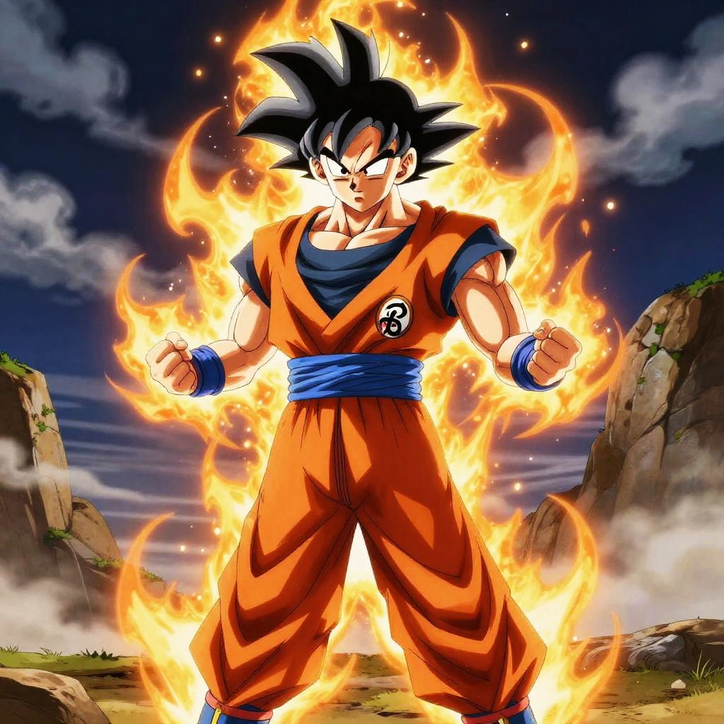 Dbz qui flying through a stormy sky with lightning bolts, muscular build, sharp features, dynamic motion blur, cinematic lighting, epic anime style