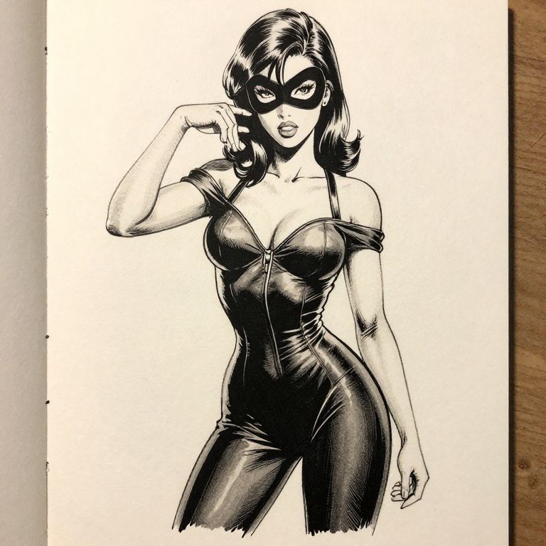 Black-and-white ink drawing of a sexy, masked woman in a tight, strapless leather bodysuit, striking a confident pose.