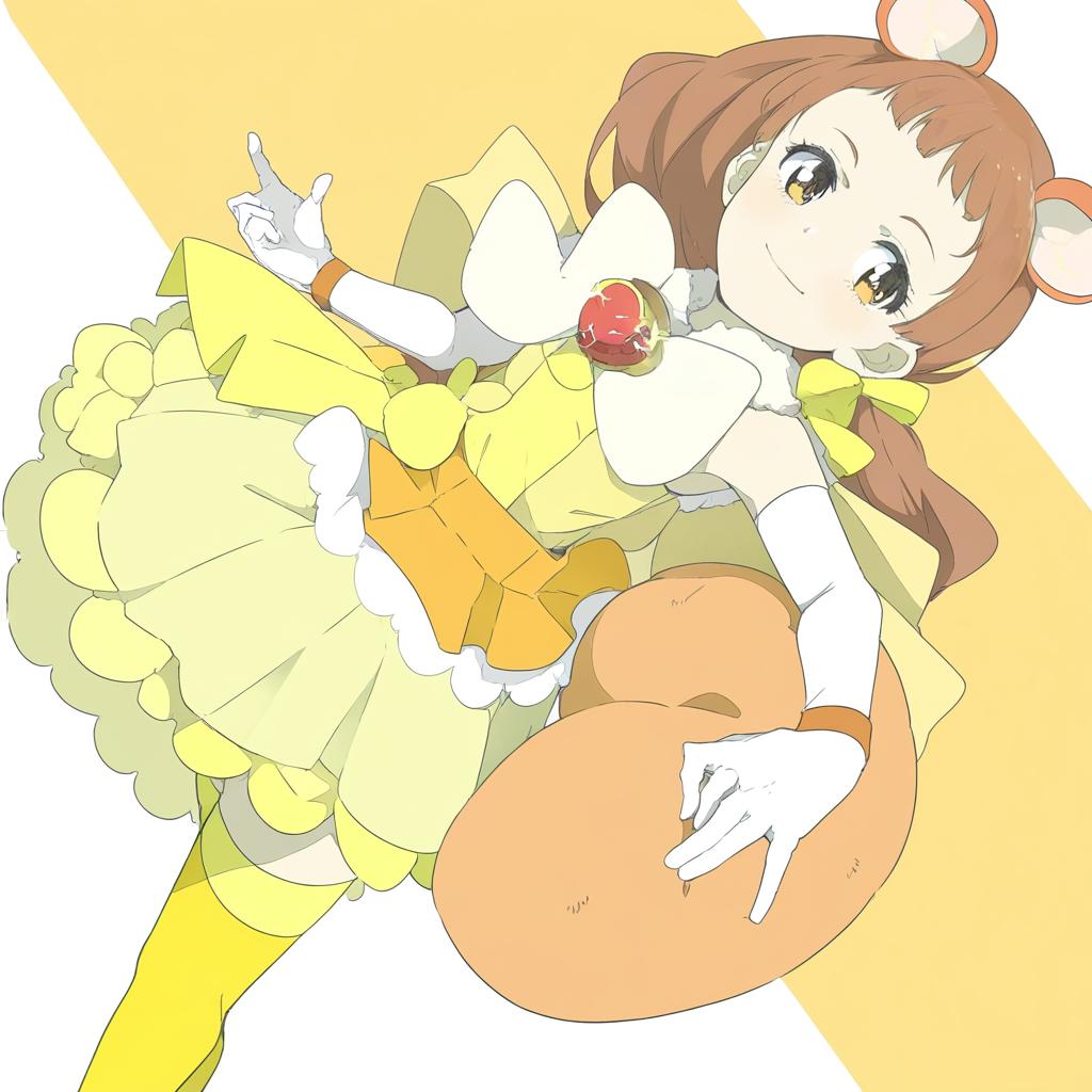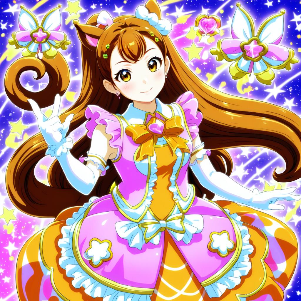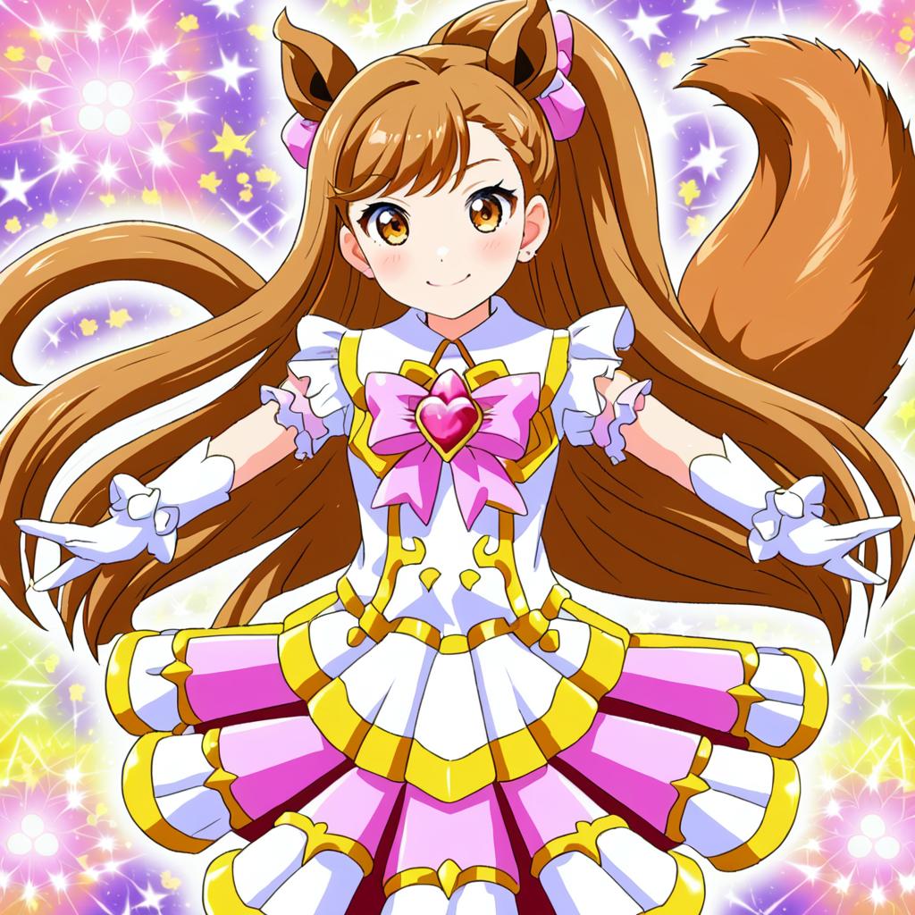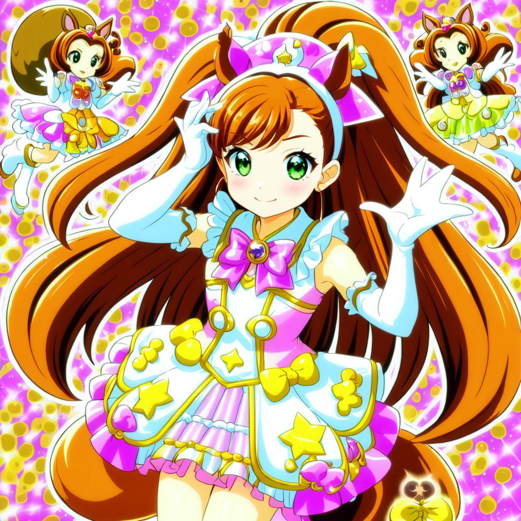 Arisugawa himari, kirakira precure a la mode, 1girl, squirrel tail, squirrel ears, orange tail, extra ears, brown eyes, brown hair, long hair, ponytail, white gloves, elbow gloves, magical girl, magical girl, by artist cedar (cedar japonica), animagine