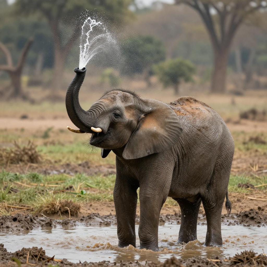 A photograph of a young elephant standing in a muddy waterhole, playfully spraying water from its trunk. The elephant's gray, wrinkled skin contrasts with the green and brown grassy banks and the blurry, brownish forest in the background. Water droplets are frozen mid-air, adding a dynamic feel to the image. The scene is natural and lively, capturing a moment of playful behavior in the wild.