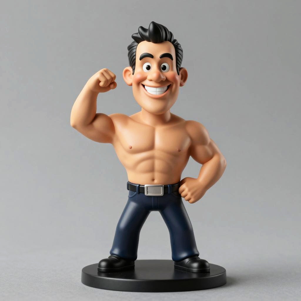 A caricature figurine of a muscular man with exaggerated features, including a broad smile and confident pose. The figure is shirtless, showing detailed muscle definition, with black pants, a belt, and black shoes. Styled in a playful, cartoonish design.