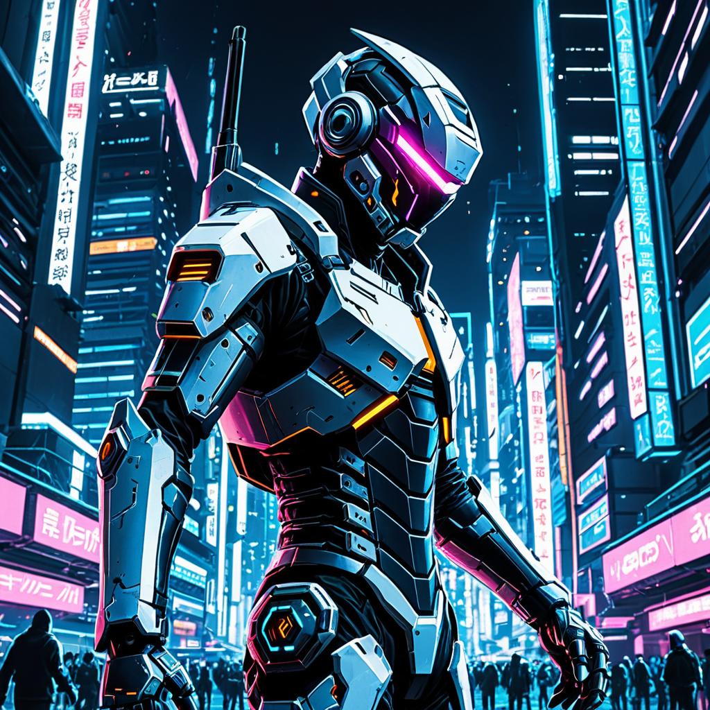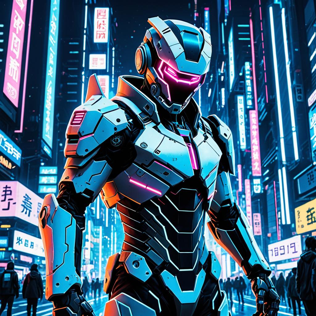 A cybernetic hacker clad in advanced futuristic armor with glowing neon blue trims stands in a vibrant, holographic digital cityscape filled with tall skyscrapers and illuminated Asian-style neon signs. The scene captures an intense, anime-inspired style emphasizing high technology and cyberpunk aesthetics.