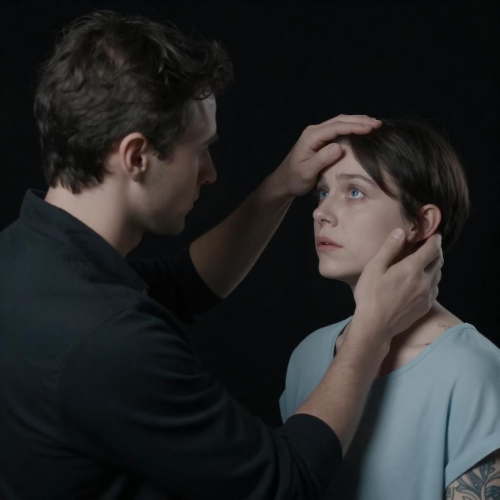 Photograph of a dark scene. A man with short dark hair, wearing a black shirt, gently touches a woman's forehead with his right hand. The woman has short dark hair, pale skin, and blue eyes, wearing a light blue top with a visible tattoo on her neck. She looks up with a slightly surprised expression. The background is black. The man is on the left, and the woman is on the right. Two people.