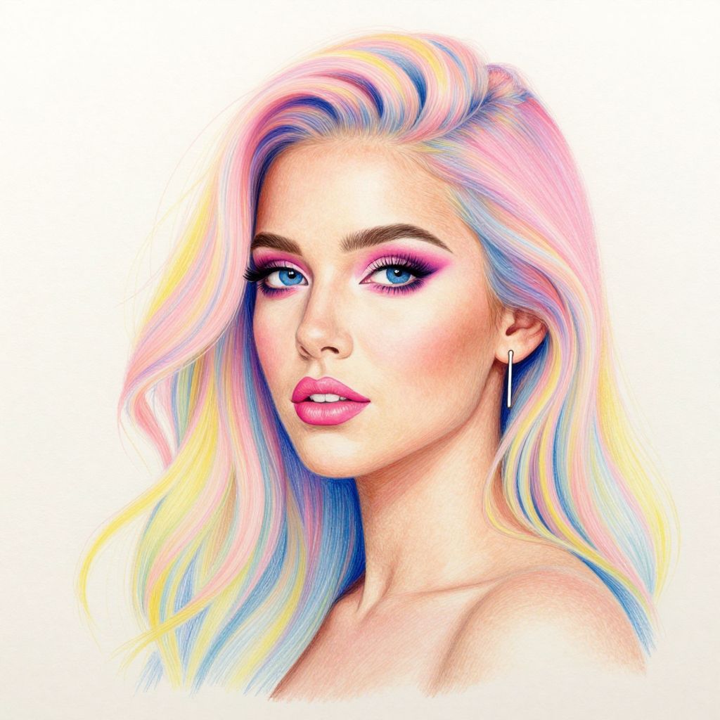 Vibrant portrait showcases a woman with cascading hair dyed in pastel hues of pink, yellow, and blue, complemented by bold makeup and a minimalist earring, rendered with meticulous detail using color pencils and paint.