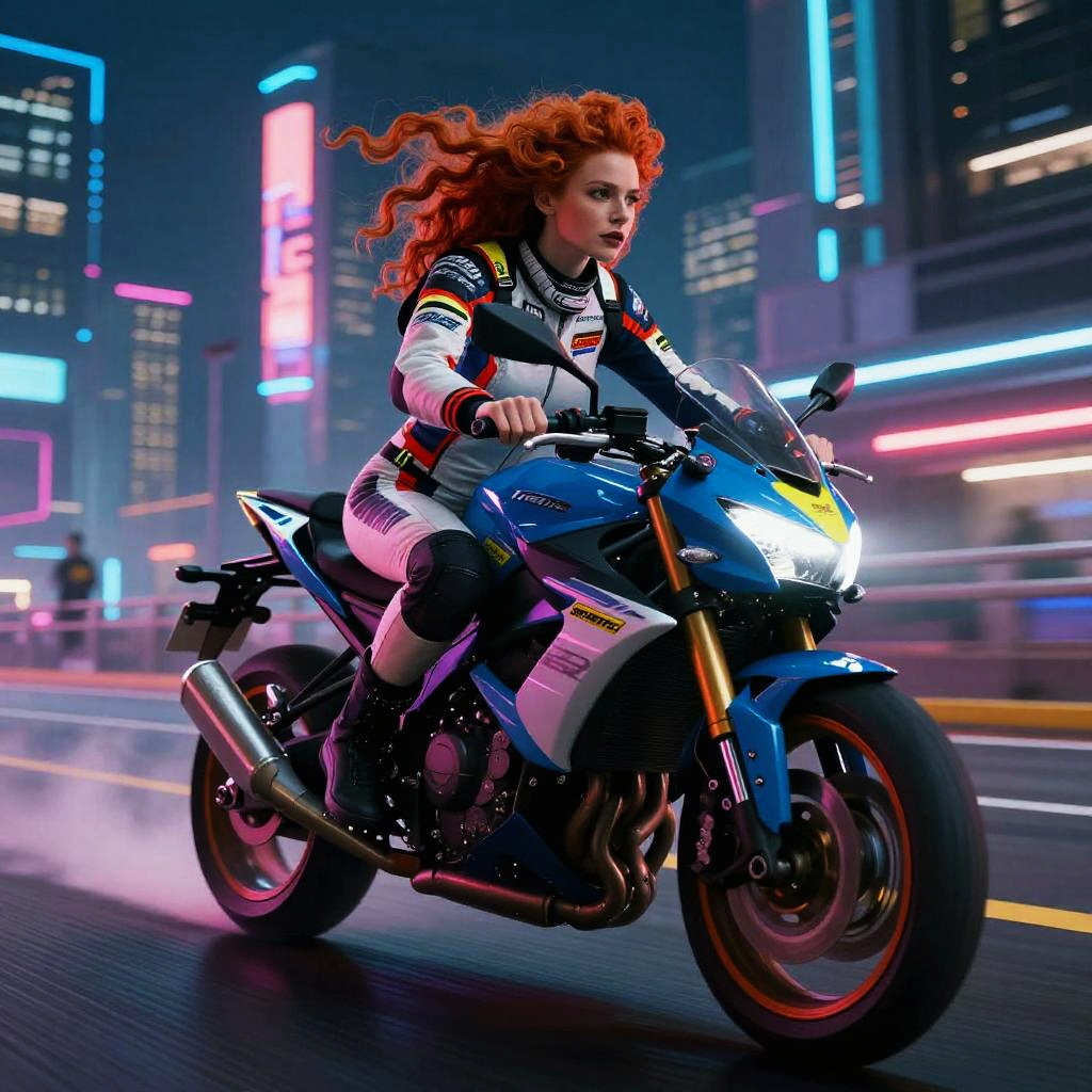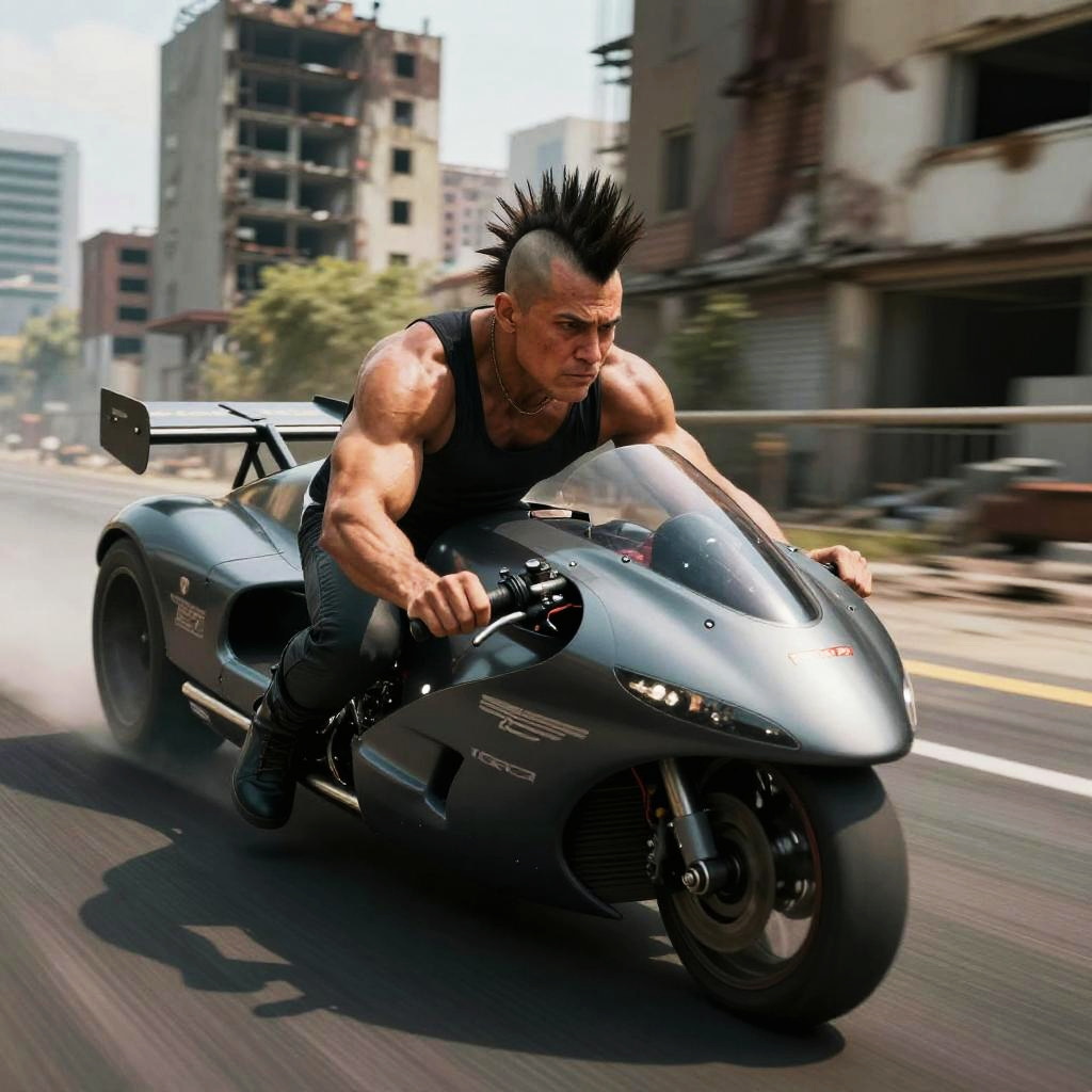 Man with a mohawk as high-speed adventuress and professional racer Urban Fury, from the high-stakes and adrenaline-fueled abandoned cityscape race, muscular, sleek, cinematic, dramatic shadows, intense motion blur, ultra-detailed
