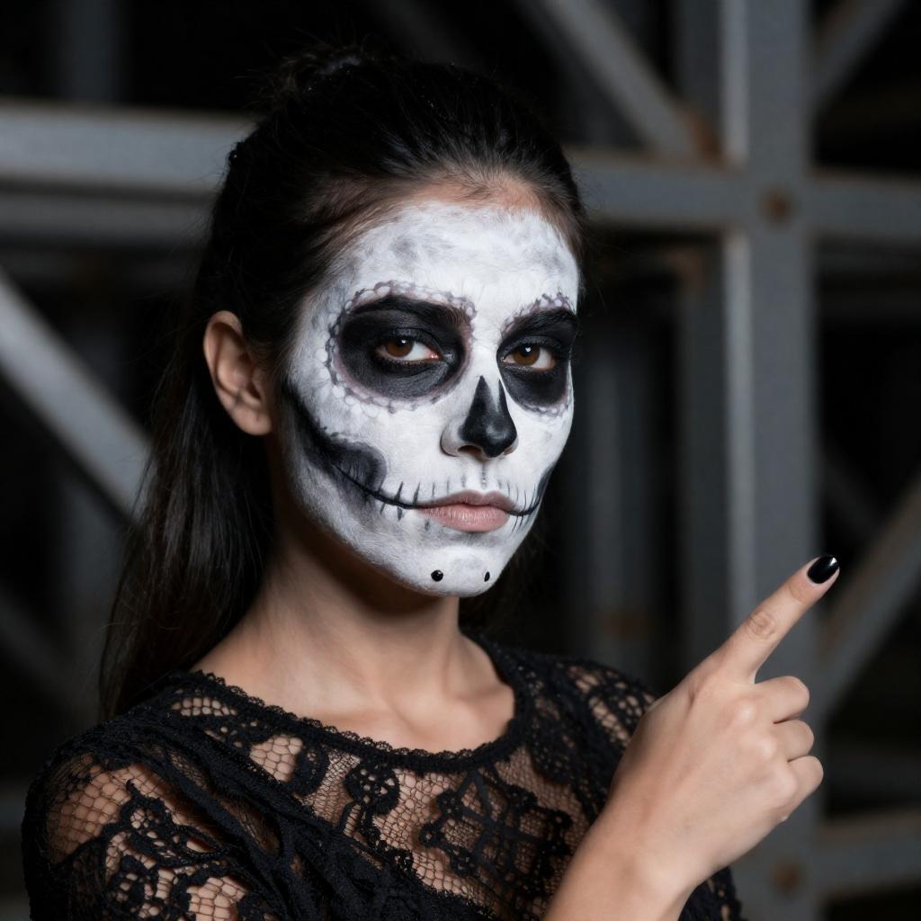 Woman with white and black skull face paint, intense eyes, dark hair in ponytail, black lace top, black nail polish, pointing right. Industrial background with metal structures. Close-up, dramatic lighting. One person.