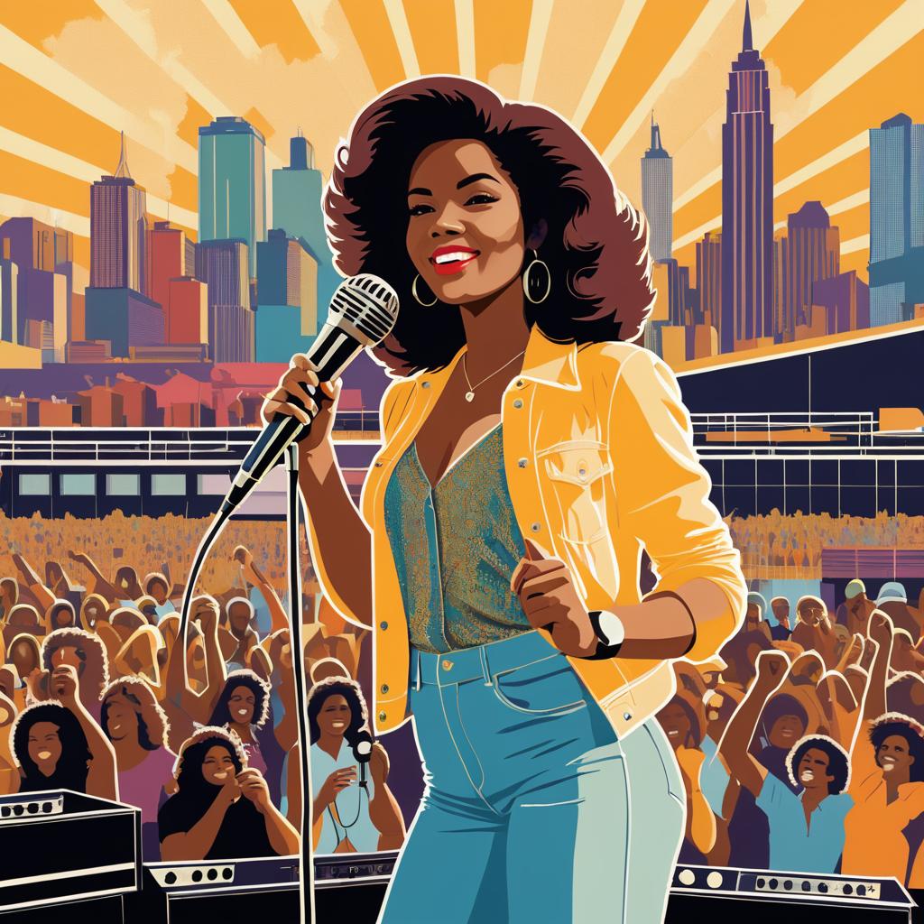 A 25-year-old woman, standing on an outdoor concert stage, holding a vintage microphone, with a lively city skyline in the background, 1970s-inspired warm and energetic poster style, detailed and nostalgic