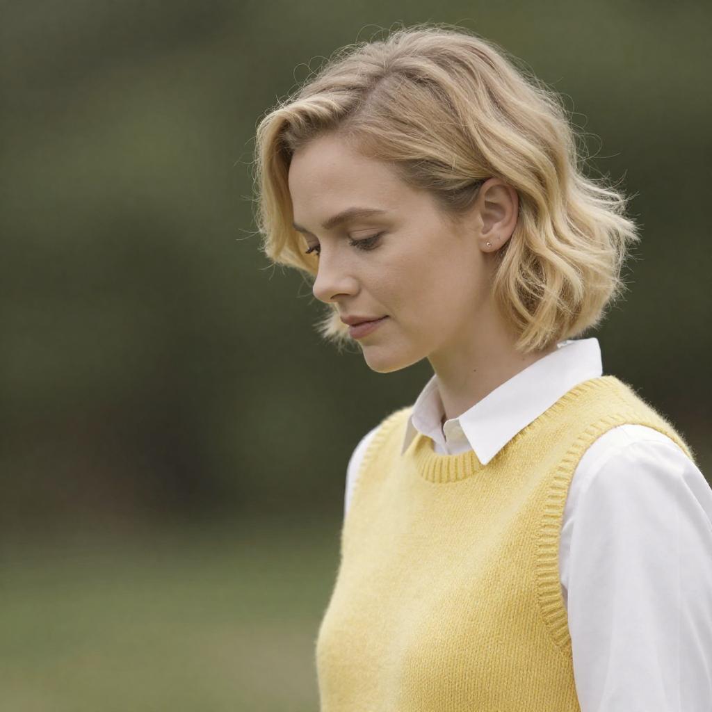 Photograph of a blonde woman with closed eyes, playing a yellow acoustic guitar outdoors. She has light skin and is topless. Blurred background with a child in a red shirt and blue hat. Sunlight filters through trees.