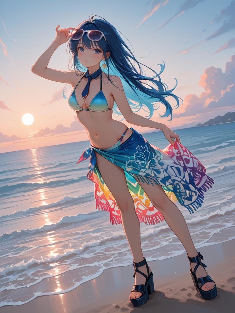 1girl, realistic face, Triangle bikini, deep ocean blue, quick-dry spandex, halter neck design, low-rise bikini bottom, seamless finish, lightweight sarong, tie-dye pattern, breathable rayon, ankle-length, crochet beach pants, white cotton, intricate fringe details, oversized sunglasses, retro style, mirrored lenses, chunky platform sandals, cork material, vibrant accents.