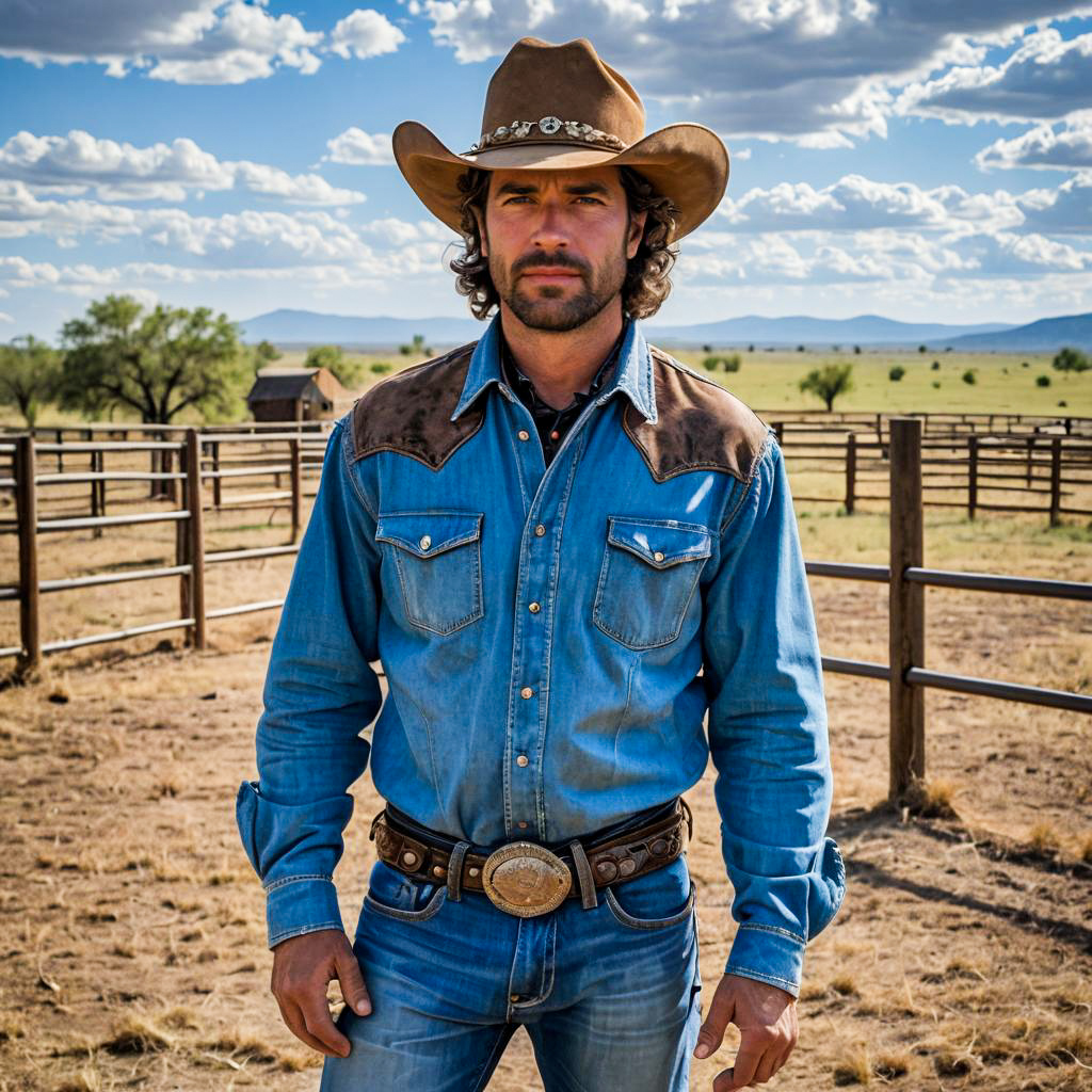 Portrait of a man wearing a brown cowboy hat, denim shirt, ripped leather jeans, and a leather belt with a detailed buckle standing at a cattle ranch. The man has wild curly hair with a serious expression, set against a background of open fields and fences under a partly cloudy sky.