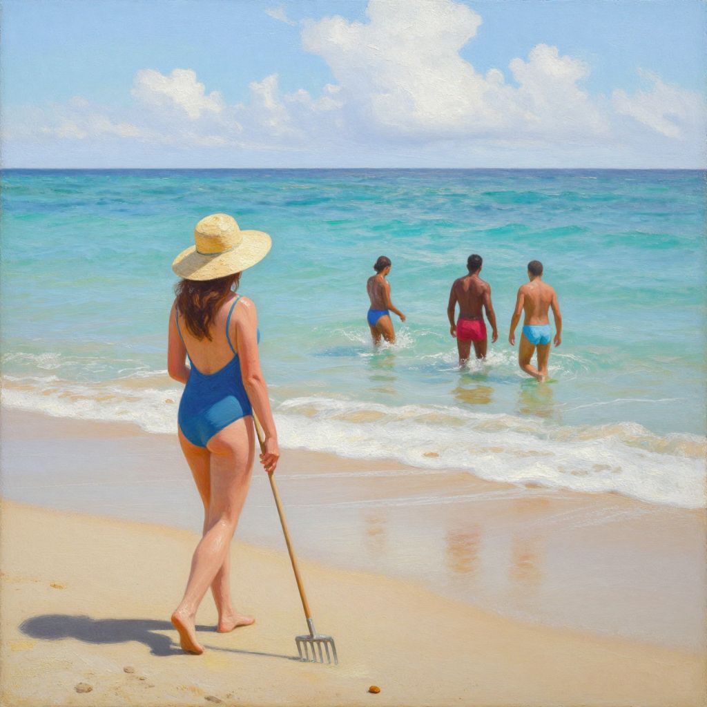 Photograph of a woman in a blue swimsuit and straw hat holding a rake, walking on a sunny beach, watching four men in swim trunks