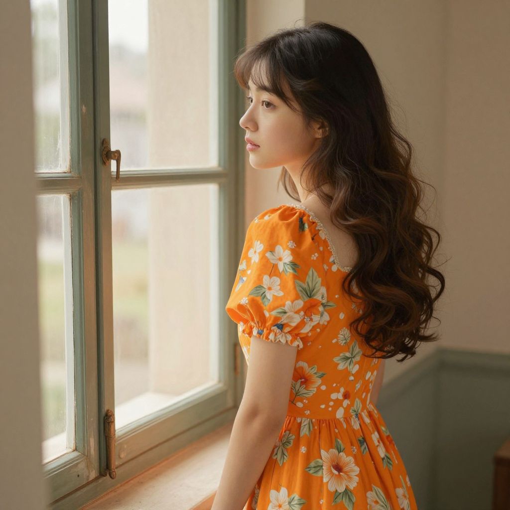 Photograph of a young woman with long, wavy brown hair, wearing an orange floral dress, gazing out a sunlit window.