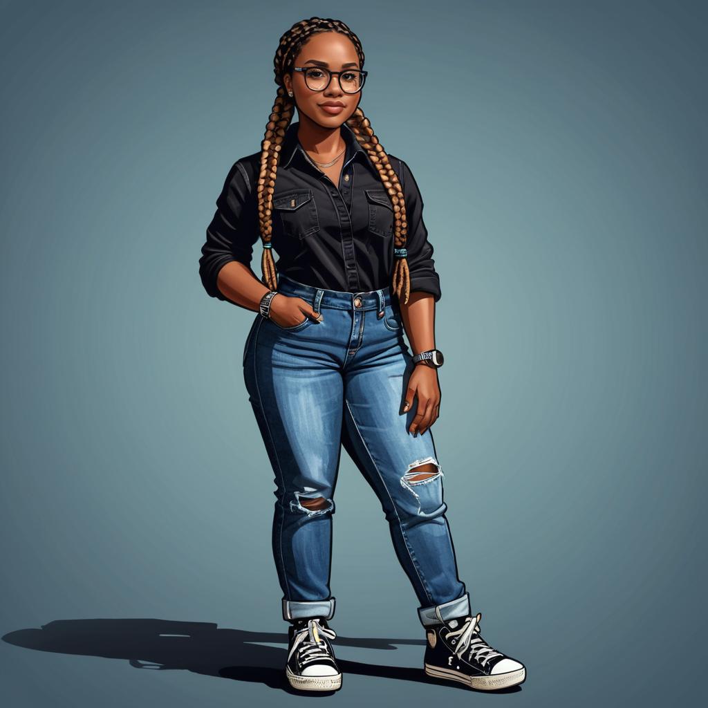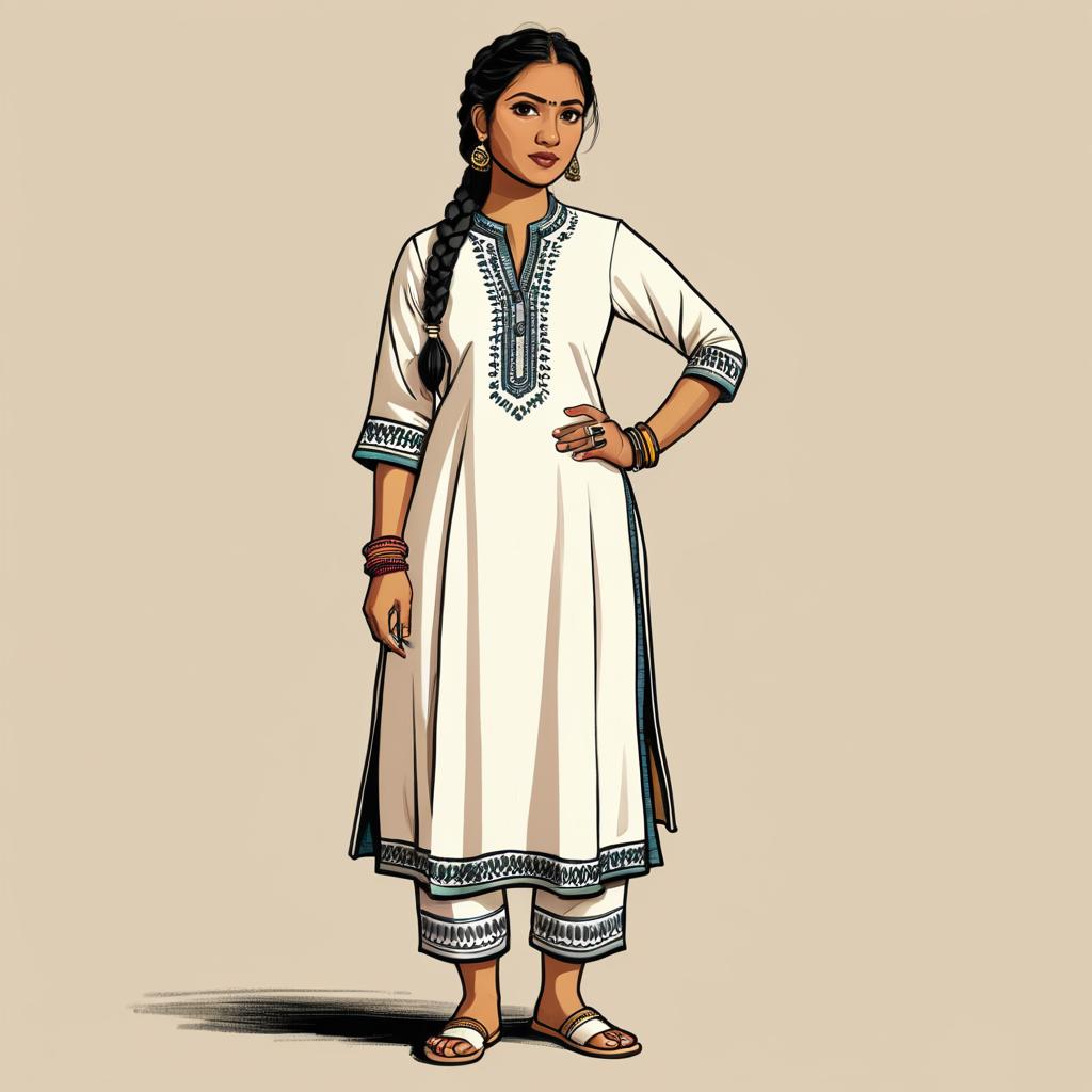 Full-body cartoon illustration of a South Asian woman with a braid, wearing kurta and leggings, jhumka earrings, fair-skinned.