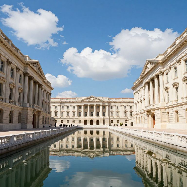 Photograph of a grand neoclassical building courtyard under a bright blue sky with scattered white clouds. The courtyard features a reflective canal running down the center, flanked by two symmetrical, cream-colored buildings with tall columns and ornate architectural details. The buildings' reflections are mirrored in the calm water. Small groups of people, dressed in dark clothing, are scattered along the stone pathways. The scene is bathed in sunlight, highlighting the buildings' intricate carvings and the smooth texture of the stone. The overall composition is balanced and elegant, emphasizing the architectural beauty and serene atmosphere.