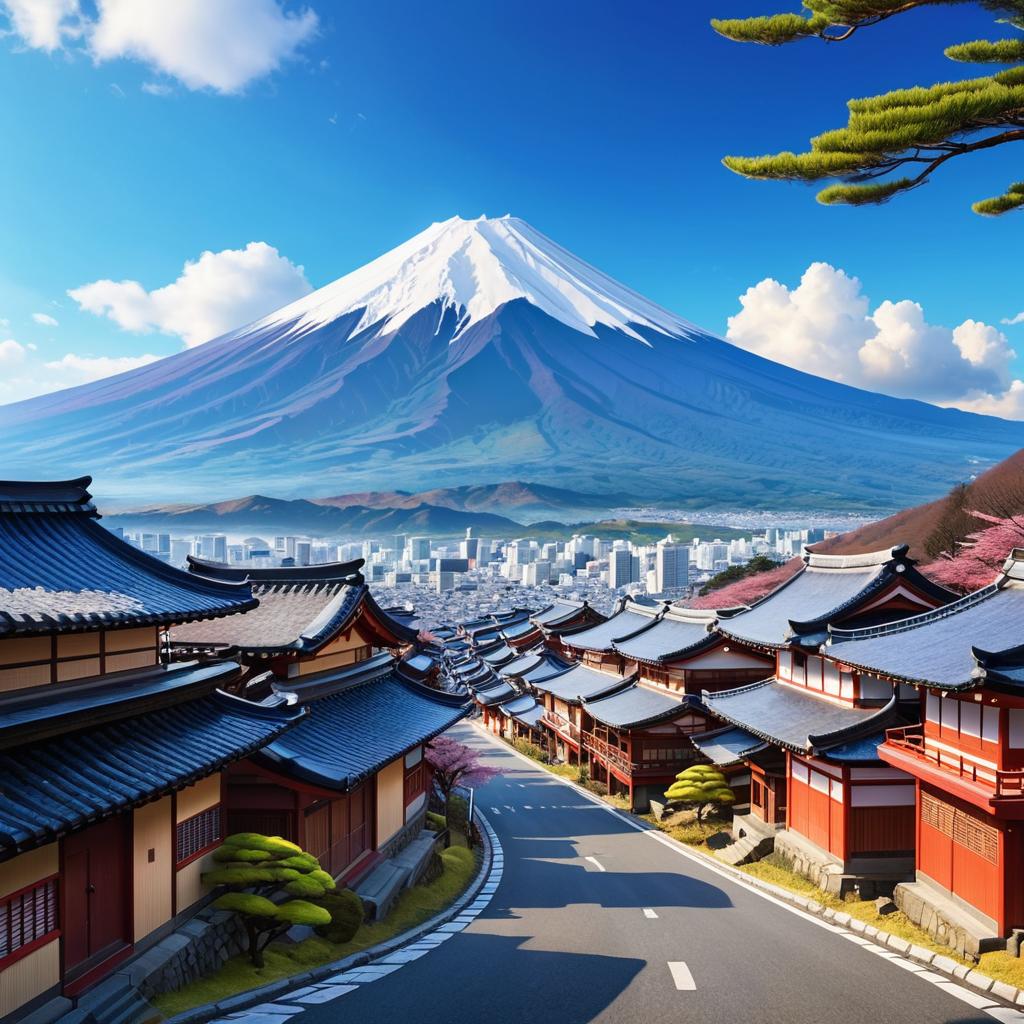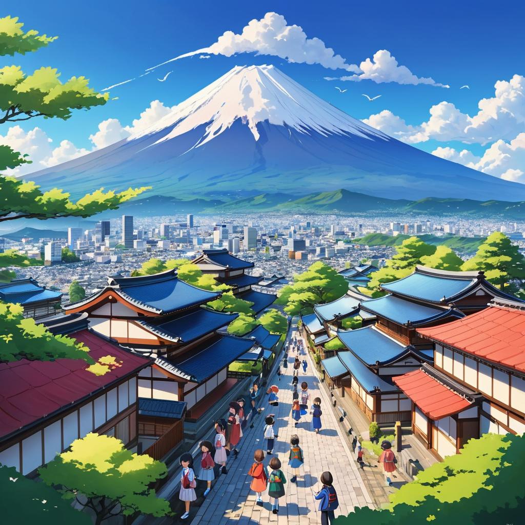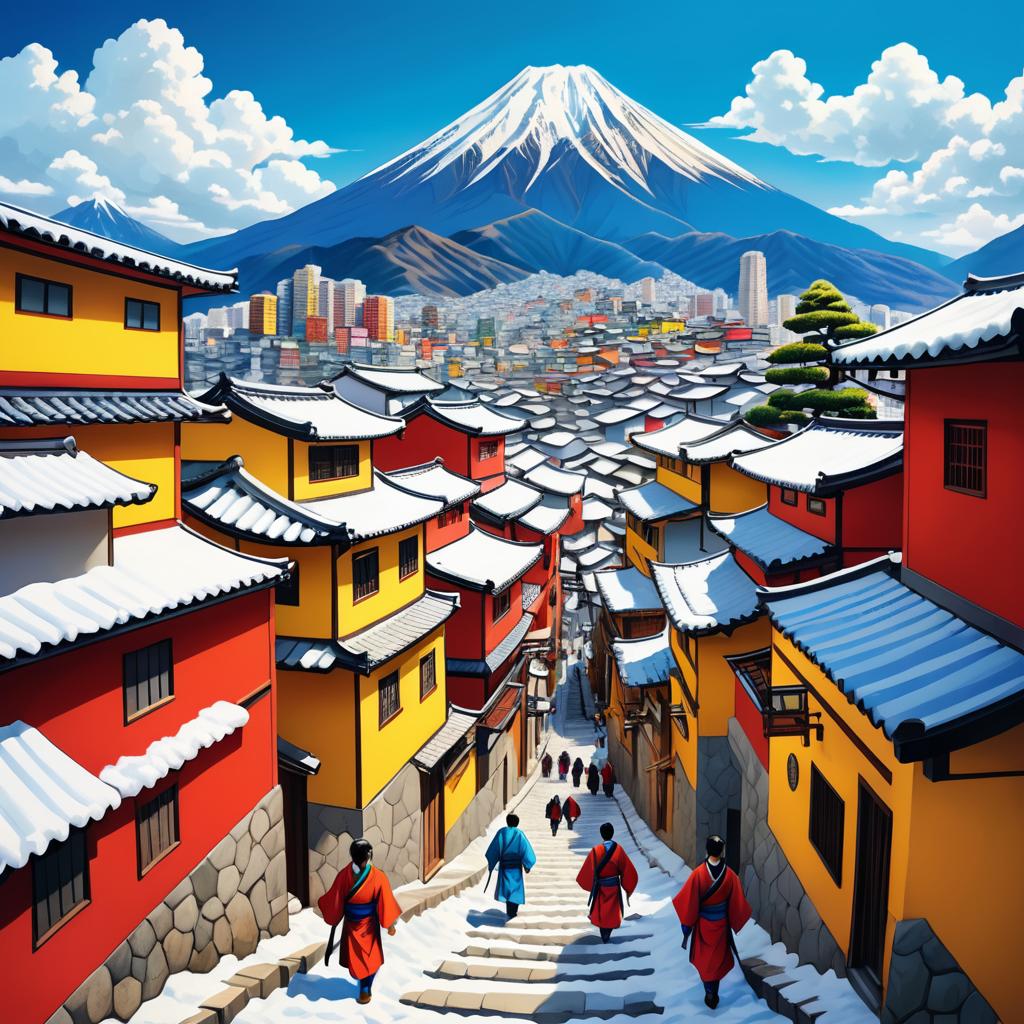 A detailed and vibrant cityscape along a steep mountainside, filled with tightly packed colorful buildings primarily in yellow, red, and blue colors. Numerous people are visible walking on narrow streets and stairways. In the background, a majestic snow-capped mountain rises under a bright blue sky with scattered white clouds. The artwork resembles a Japanese manga or comic style with intricate line work and lively urban atmosphere.